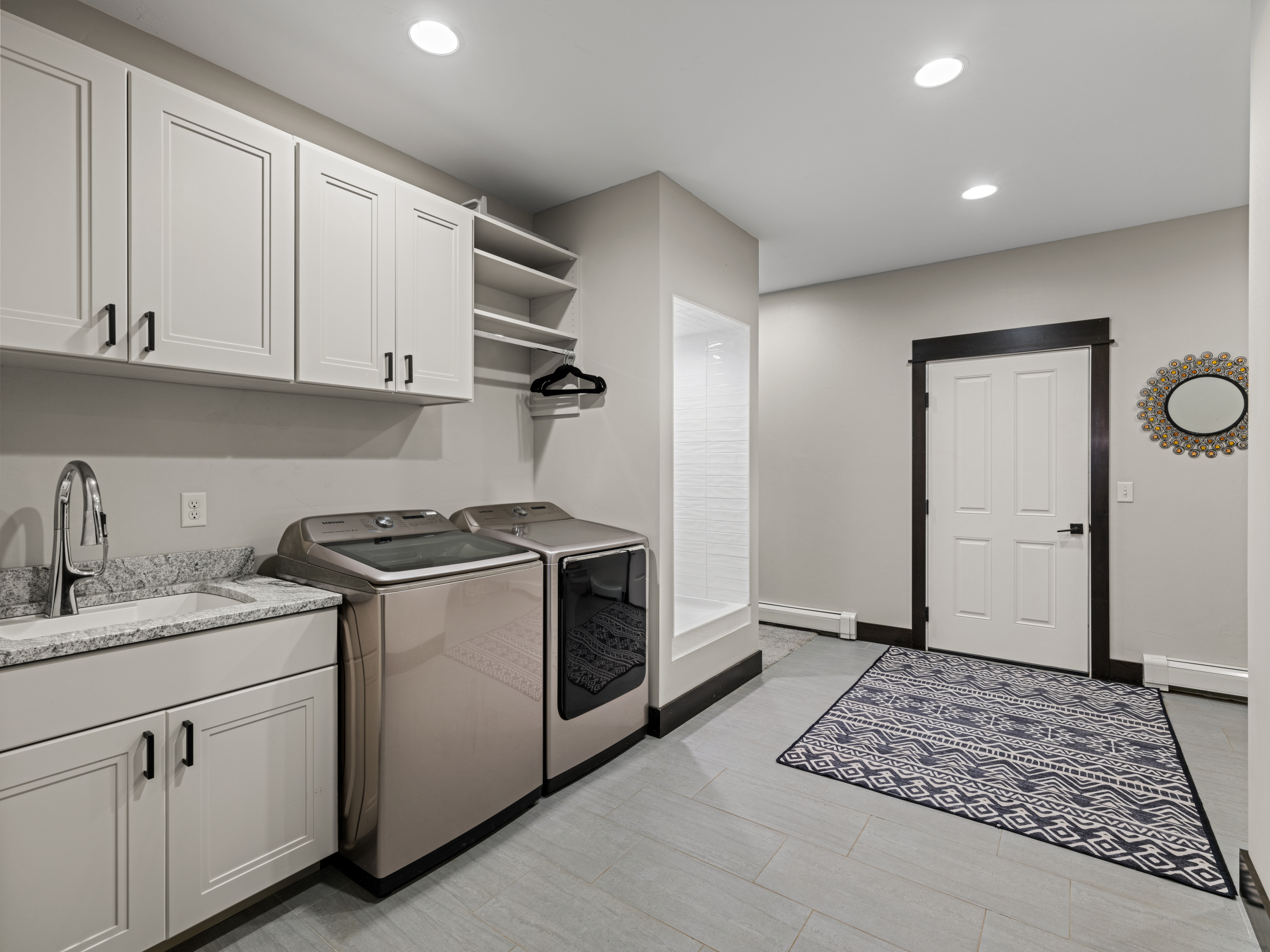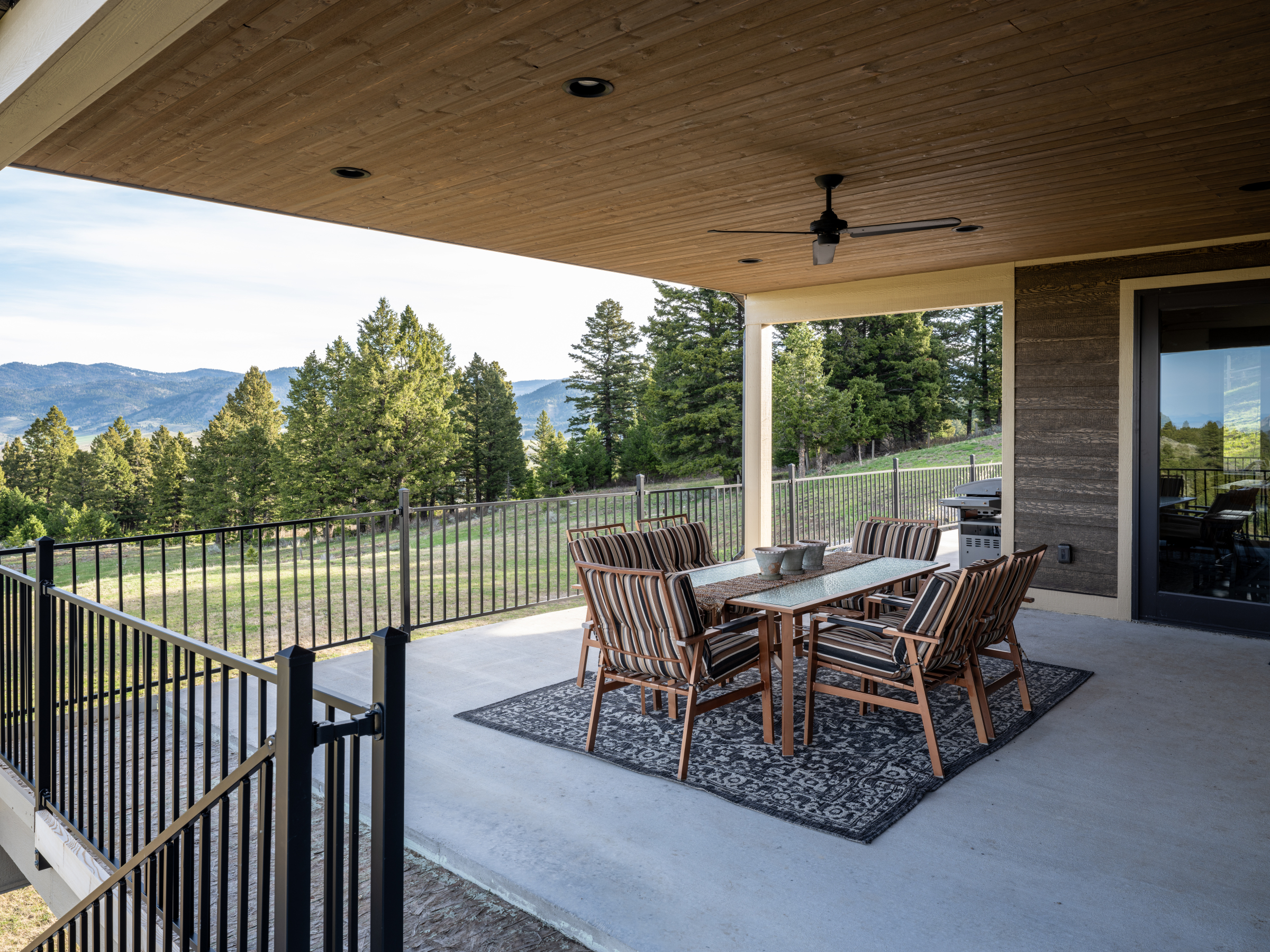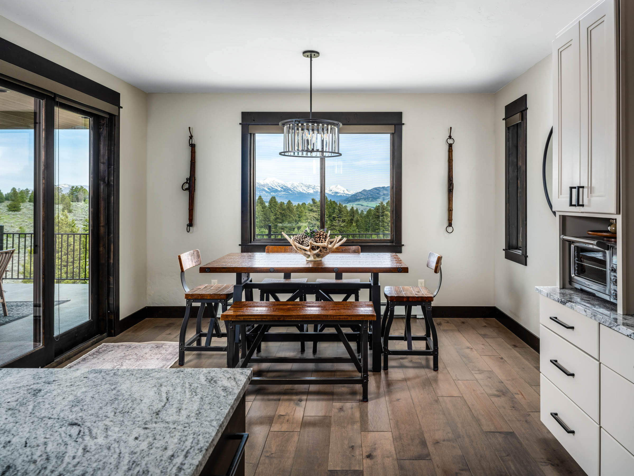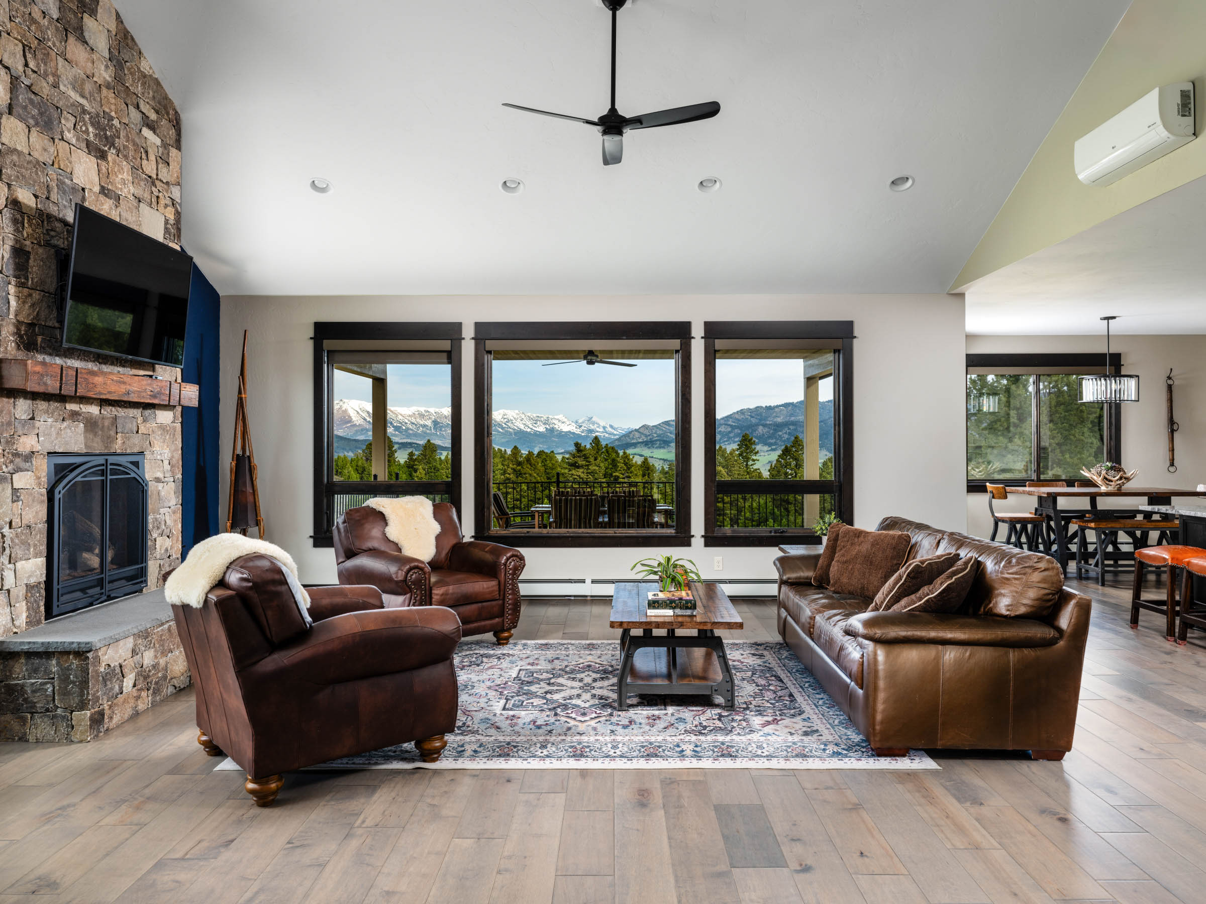 This home features many upgrades and special features. Radiant heating throughout keeps things cozy in winter. 9’ ceilings and vaulted living room featuring huge mountain views, a striking custom-built floor-to-ceiling stone surround gas fireplace, mini-split A/C and engineered hardwood floors and access to a guest powder room. A corner office is situated for excellent Frog Rock and Tobacco Root Mountain views. The gourmet kitchen features custom cabinetry, GE Café appliances, granite countertops and a dining island with storage. Dining area with an oversized slider leads to the covered patio with in-slab radiant heat (no shoveling), perfect for seamless indoor-outdoor entertaining. The adjacent mudroom/laundry area features an extra-large pantry, a built-in pet wash, and new washer and dryer.