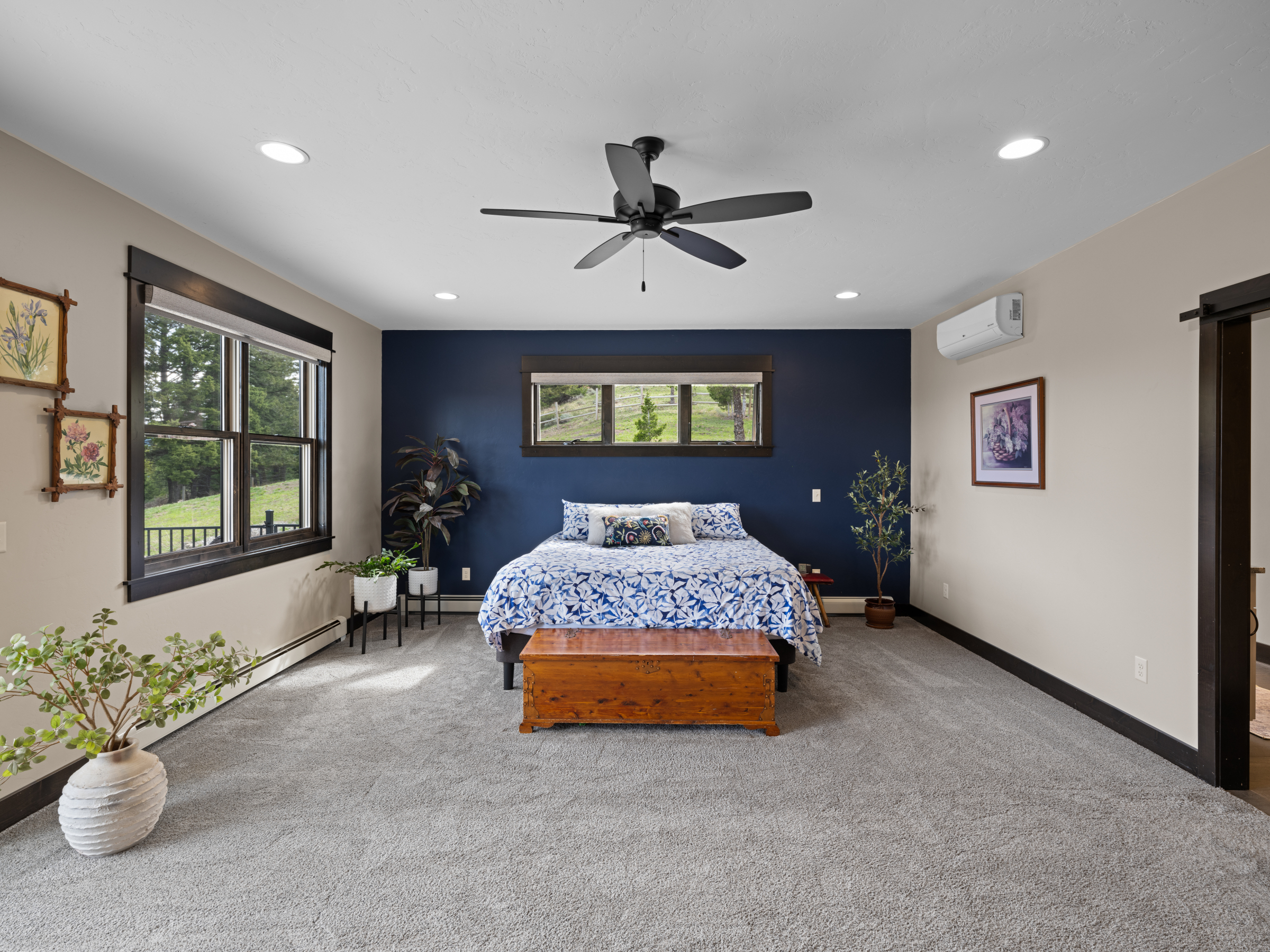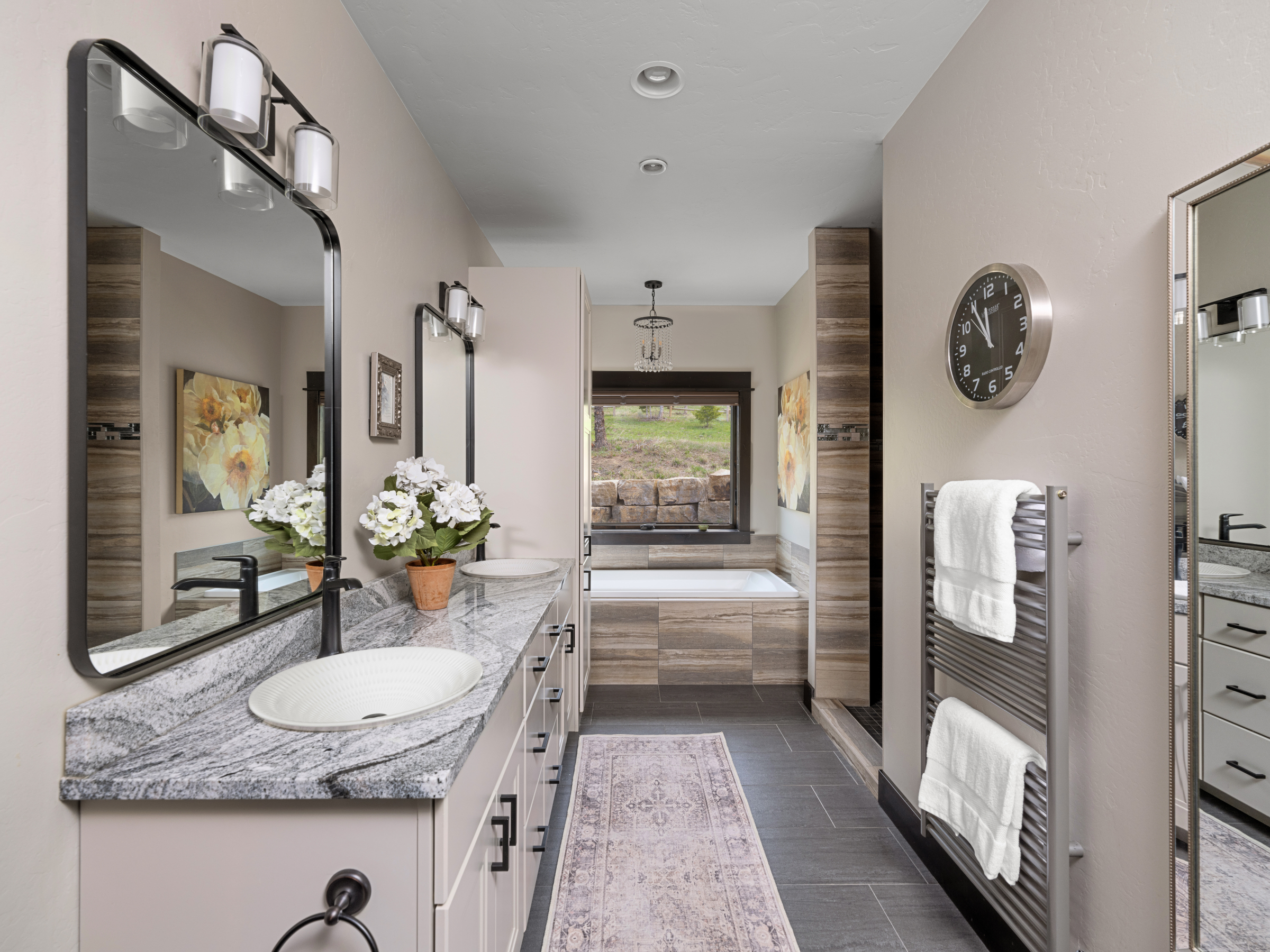 A tranquil main-level primary suite has deck access, A/C and a walk-in closet with custom shelving. The spa-like primary bath features heated tile floors, double vanities, heated towel bar, soaking tub, and an extra-large tiled, twin-head shower. The main level also features another guest bedroom with access to a ¾ bath.