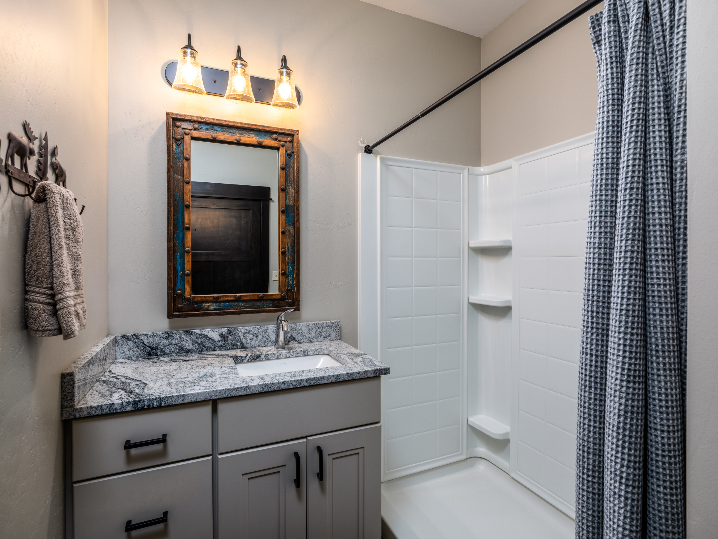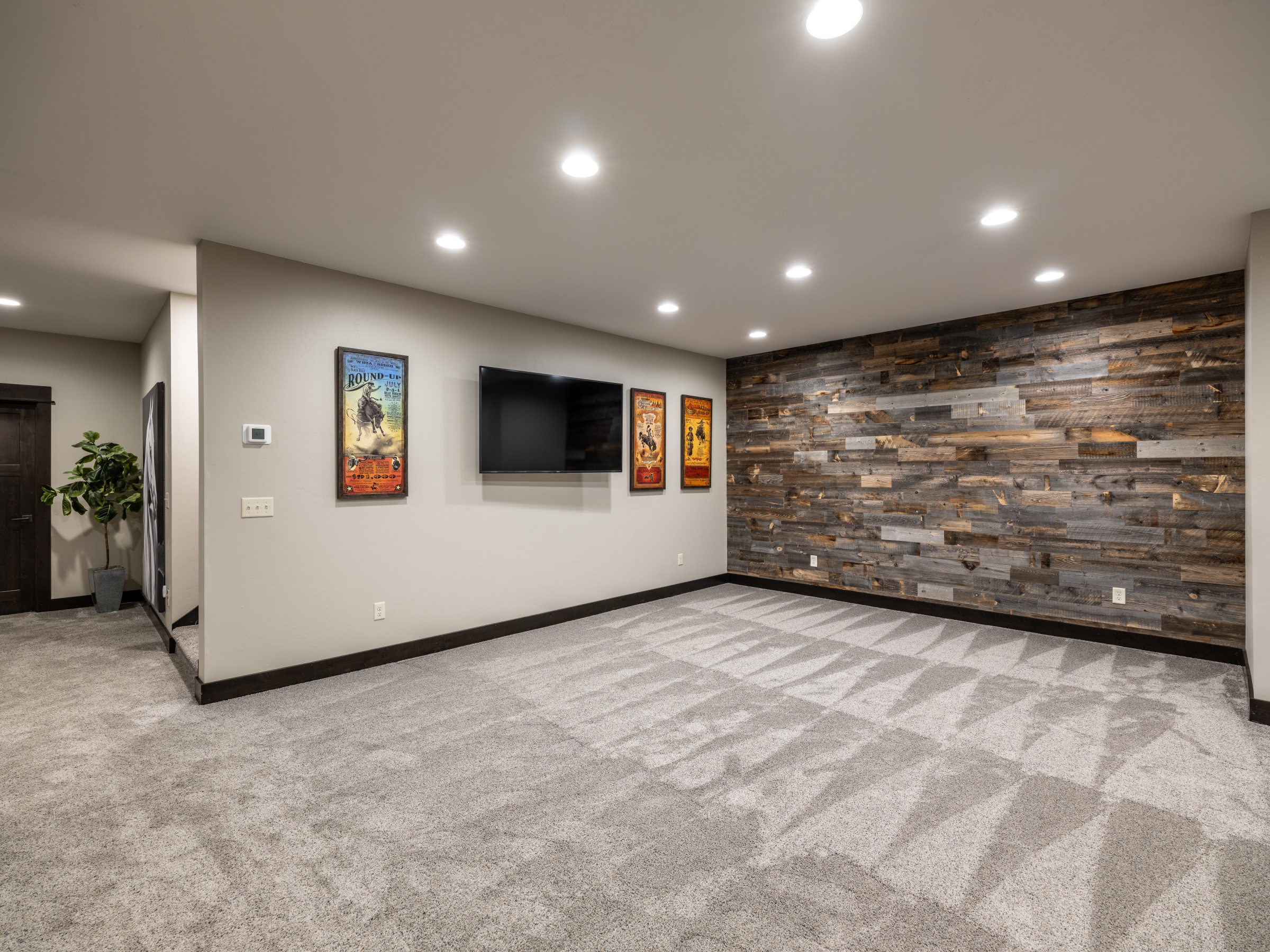 Another wide stairwell leads to the daylight lower level – featuring walk-out sliding glass doors to the covered concrete patio with in-slab heat. An expansive game/recreation room provides ample space for leisure activities. A guest bedroom with a walk-in closet and patio access, a gym and a ¾ bathroom are also located on this level.