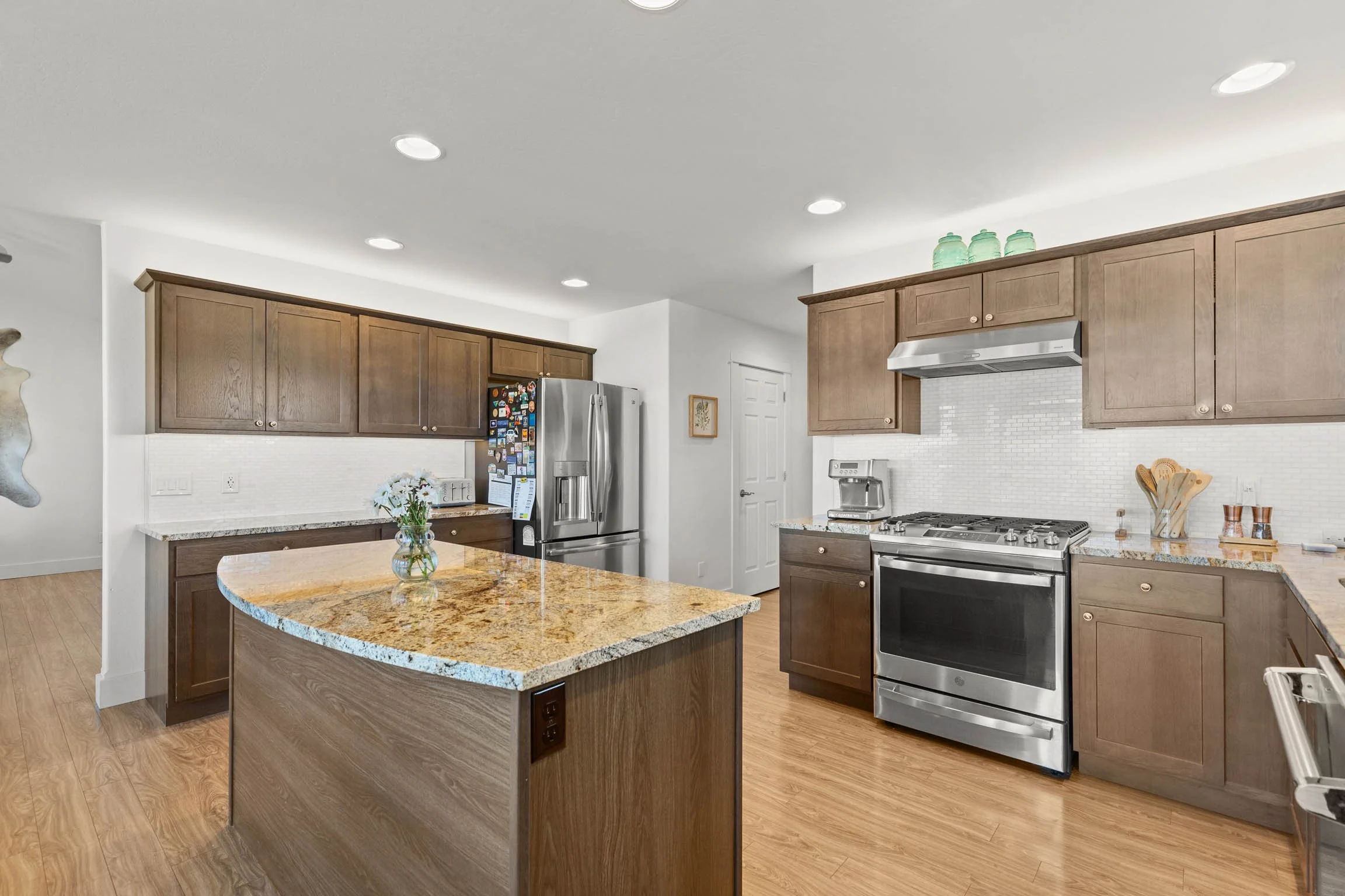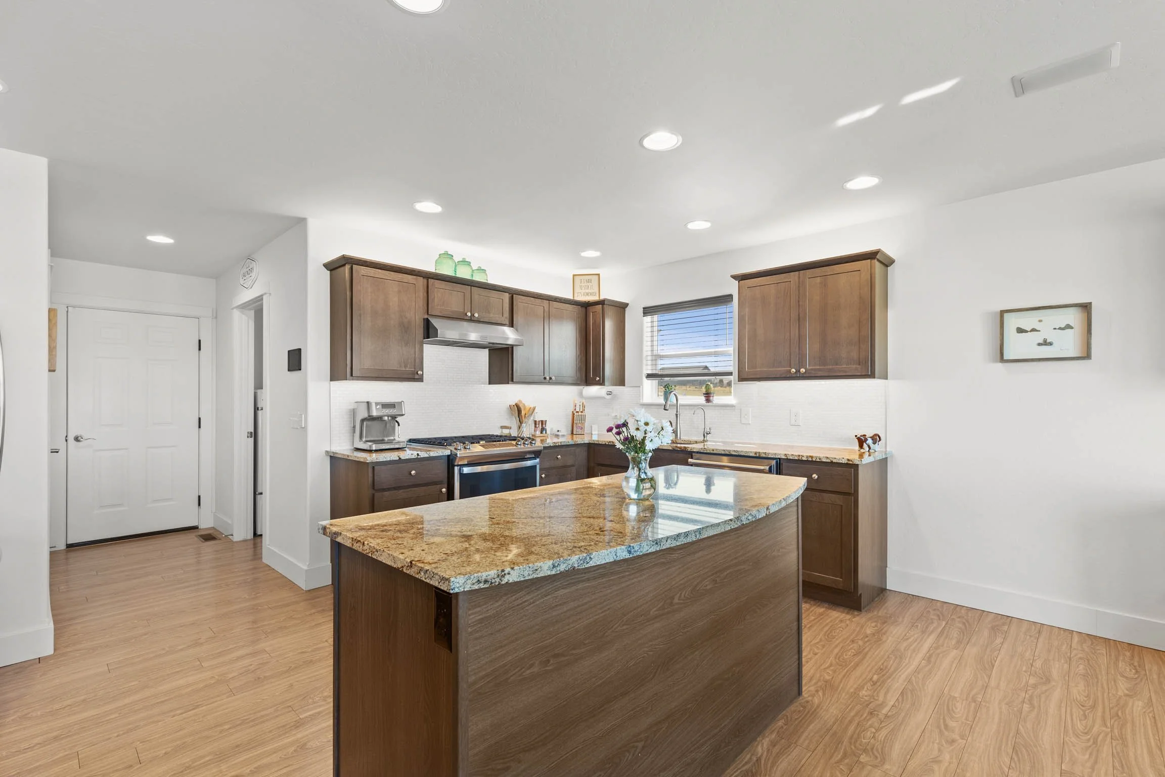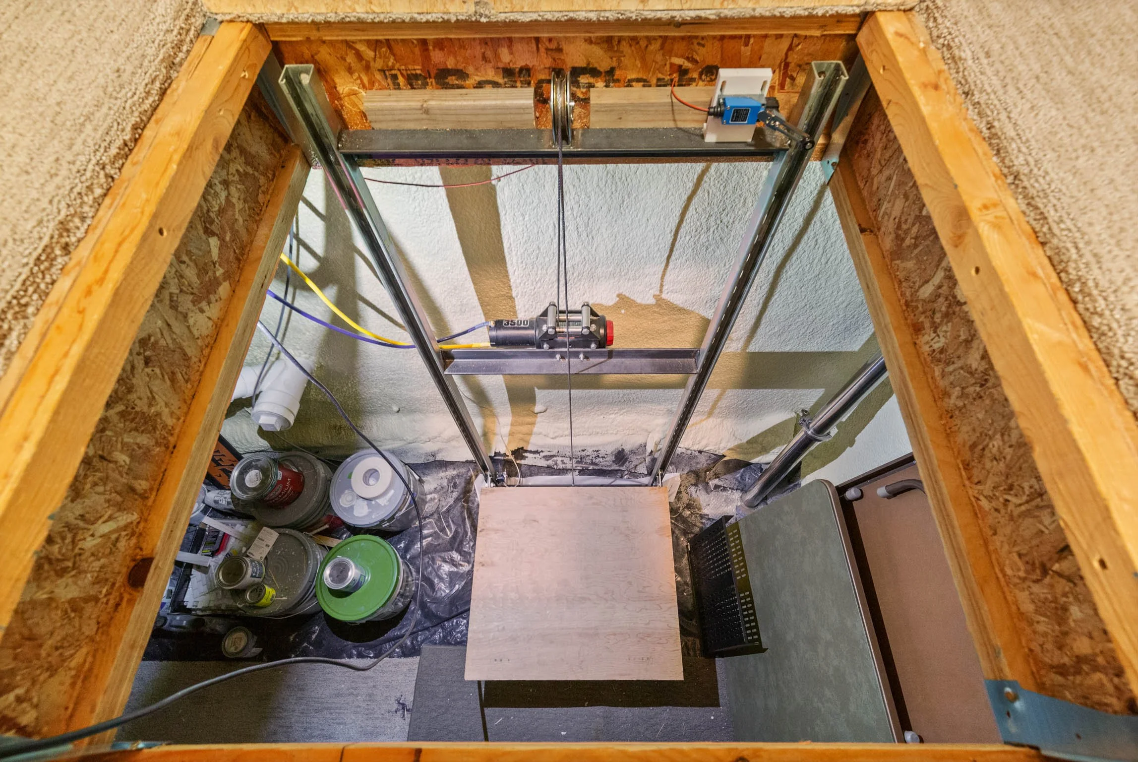 Inside, the home offers a clean, cohesive feel with durable luxury vinyl flooring throughout. The kitchen is both refined and functional, featuring granite countertops, stainless steel appliances, a gas range with hood, and under-cabinet lighting above and below. In-ceiling speakers add a subtle, elevated touch for everyday living or entertaining. The laundry room includes a utility sink, and light-blocking and wood blinds are already in place, saving a new owner both time and expense. A reverse osmosis system and water softener further enhance comfort and livability. A rare and highly functional feature is the expansive crawl space—approximately 1,900 sq ft with 6-foot ceilings—accessed by an elevator. It offers exceptional, easy-access storage that sets this home apart. The fully finished 3-car garage is insulated and heated, complete with custom-built shelving and two 50-amp circuits, providing flexibility for projects, equipment, or electric vehicle needs.