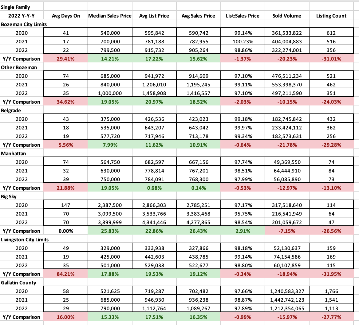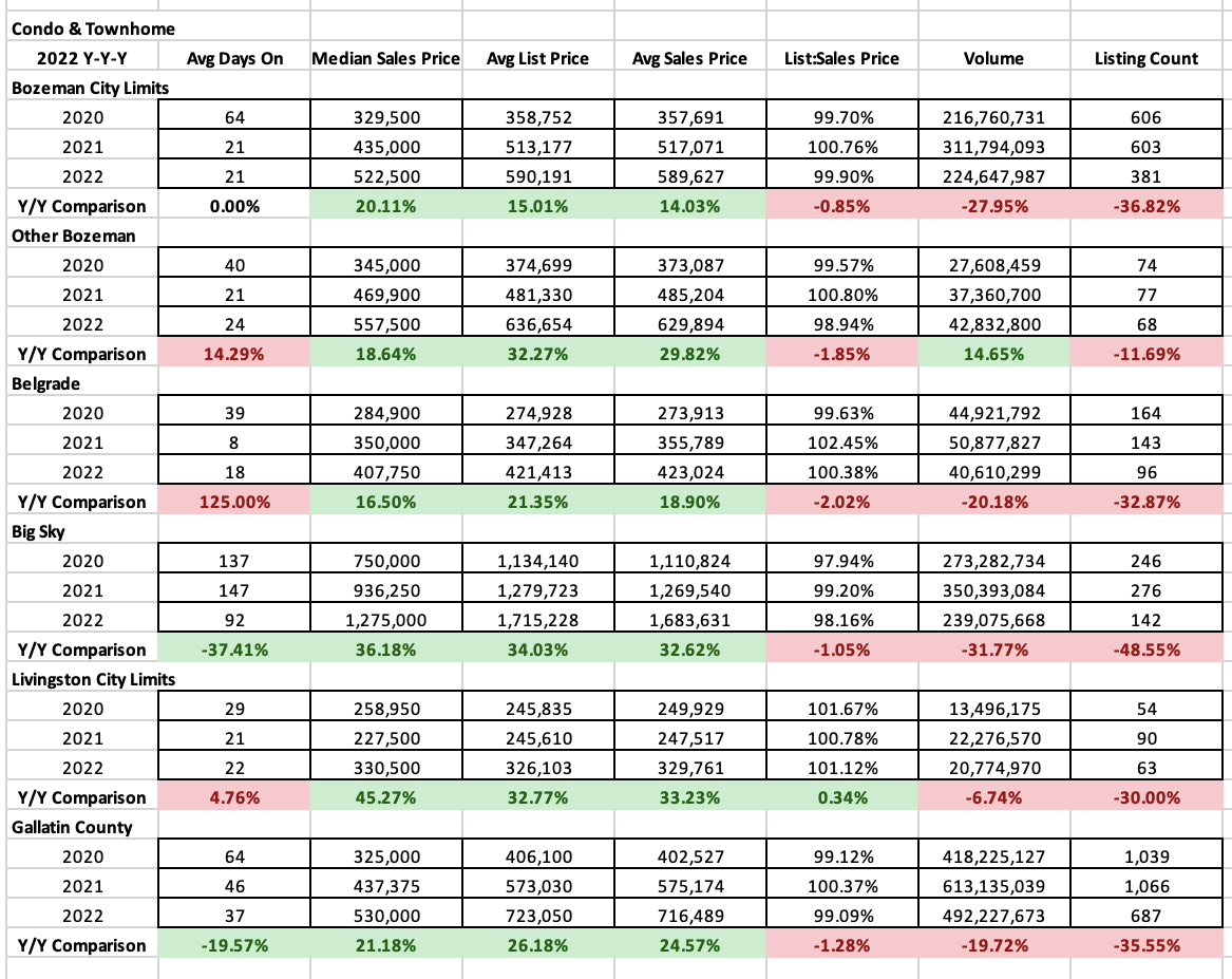 Condos and townhomes also saw positive median sales price appreciation full year 2022 over full year 2021. Typically the more affordable segment of the market, median sales prices moved 20% in City of Bozeman to $523K, 19% in greater Bozeman to $558K, 17% in Belgrade to $408K, 36% in Big Sky to $1.25M and 45% in Livingston to $331K.
