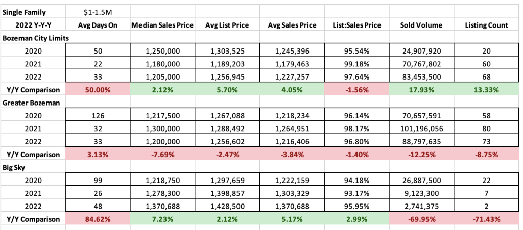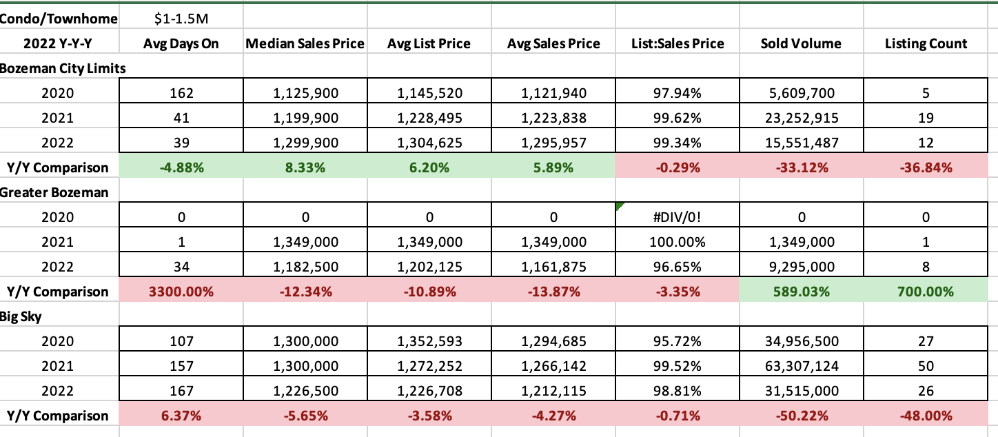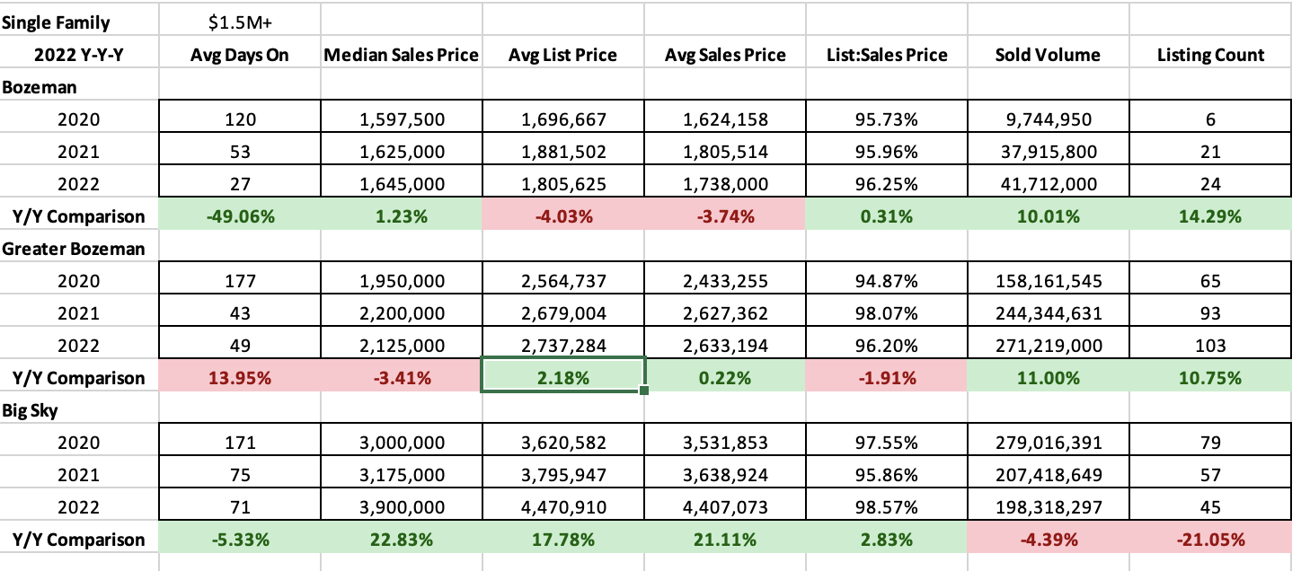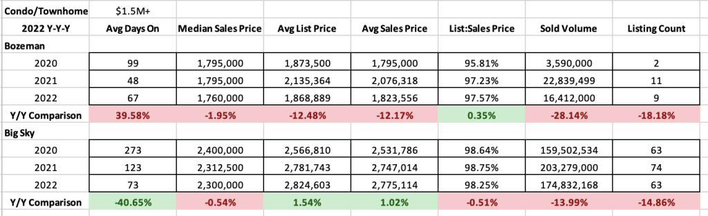 High end ($1M-$1.5M) condos and townhomes saw median sales price increase of about 9% in the City of Bozeman market and a drop of 5-12% in Greater Bozeman and Big Sky. List to sales price ratios showed less than 1% discounting on average for City of Bozeman, about 3% in Greater Bozeman and 1.2% in Big Sky. Interestingly, Greater Bozeman had almost no sales for high end condos and townhomes prior to 2022. Average days on market were down in City of Bozeman to just over a month but crept up in Greater Bozeman to just over a month and also up in Big Sky year over year at about 6 months. Number of listings sold declined 35% in City of Bozeman (12), were up 7 fold in Greater Bozeman (8) and down 48% in Big Sky (26)