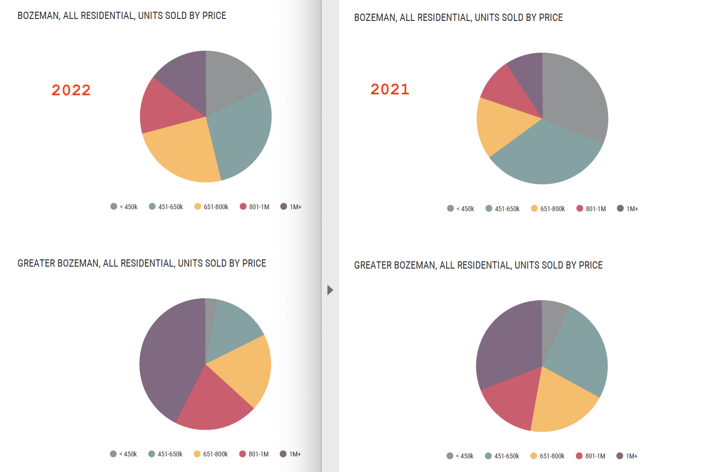 As comparison of percent of homes sold, Bozeman and Greater Bozeman saw less properties and percentage of properties under $8000K sell in 2022 than in 2021. Belgrade also became noticeably less affordable. Big Sky was almost 75% above $1M in sold price.