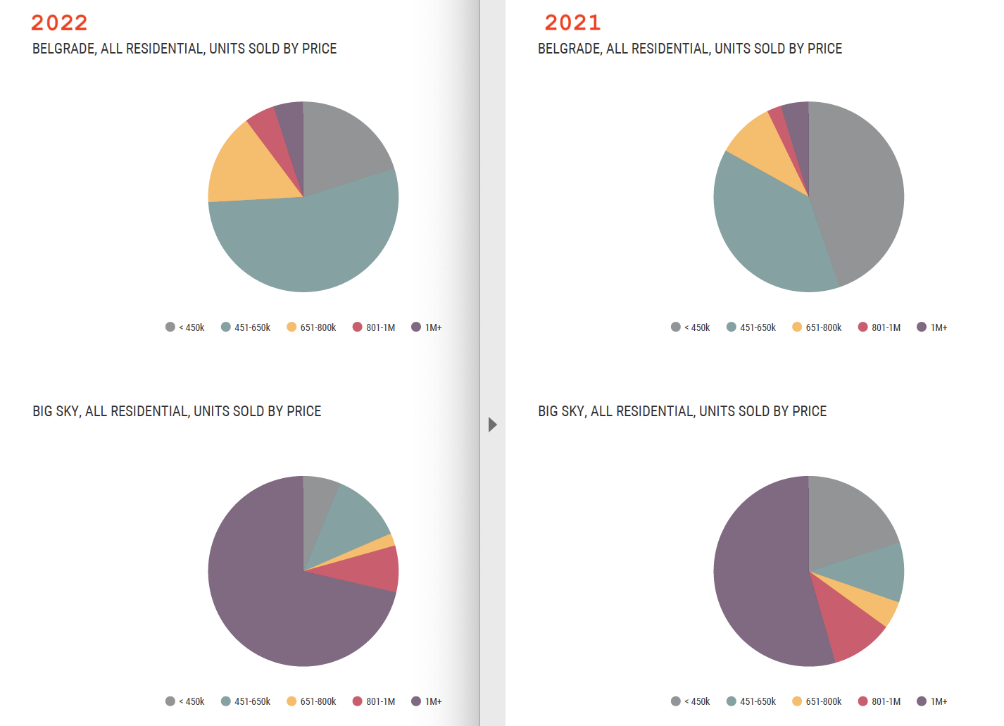 Pie chart comparison of units sold by price Belgrade and Big Sky 2021 vs 2022