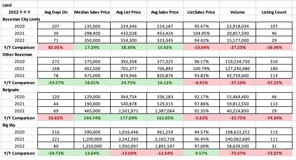 Number of properties sold trended with single family and condo/townhome sales – with significantly less volume than in 2021. Number of properties sold were off 37% in Bozeman and greater Bozeman and 72-75% off in Belgrade and Big Sky. Coming off of a huge year in 2021 – numbers are still significantly less than in 2020 for all areas. Partially due to lack of new subdivisions for lot purchase opportunity and lack of general inventory.