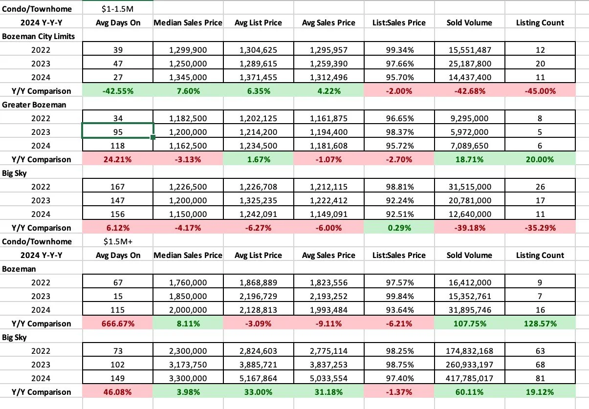 Condo and townhome median sale prices have stayed strong, with little price appreciation but also little value deflation. City of Bozeman ($535,000), Greater Bozeman ($525,000) and Belgrade ($463,500) are all flat year over year. Big Sky ($1,997,500) dropped slightly at 6% below 2023 median sale price. Livingston ($350,000) grew slightly due to increasing new construction condo product.