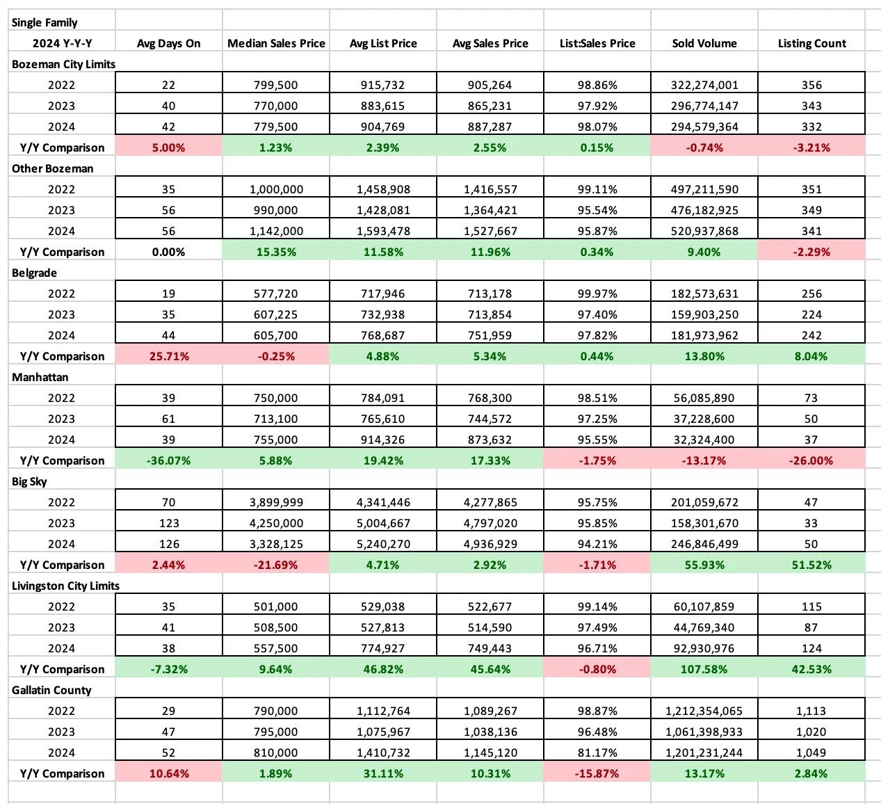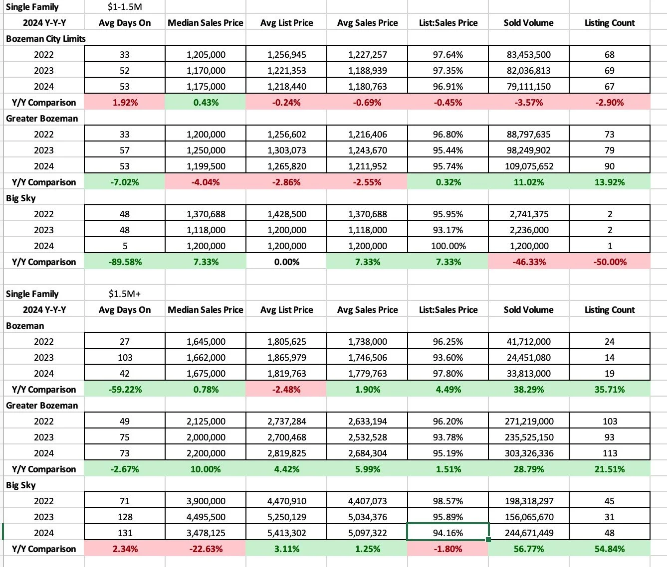 Number of units sold in 2024 were steady in most areas and declined in others – mostly due to lack of new construction inventory in those areas. It was flat in City of Bozeman year over year, grew in Belgrade due to new construction offerings, grew in Big Sky due to new construction offerings and declined in greater Bozeman and Livingston.