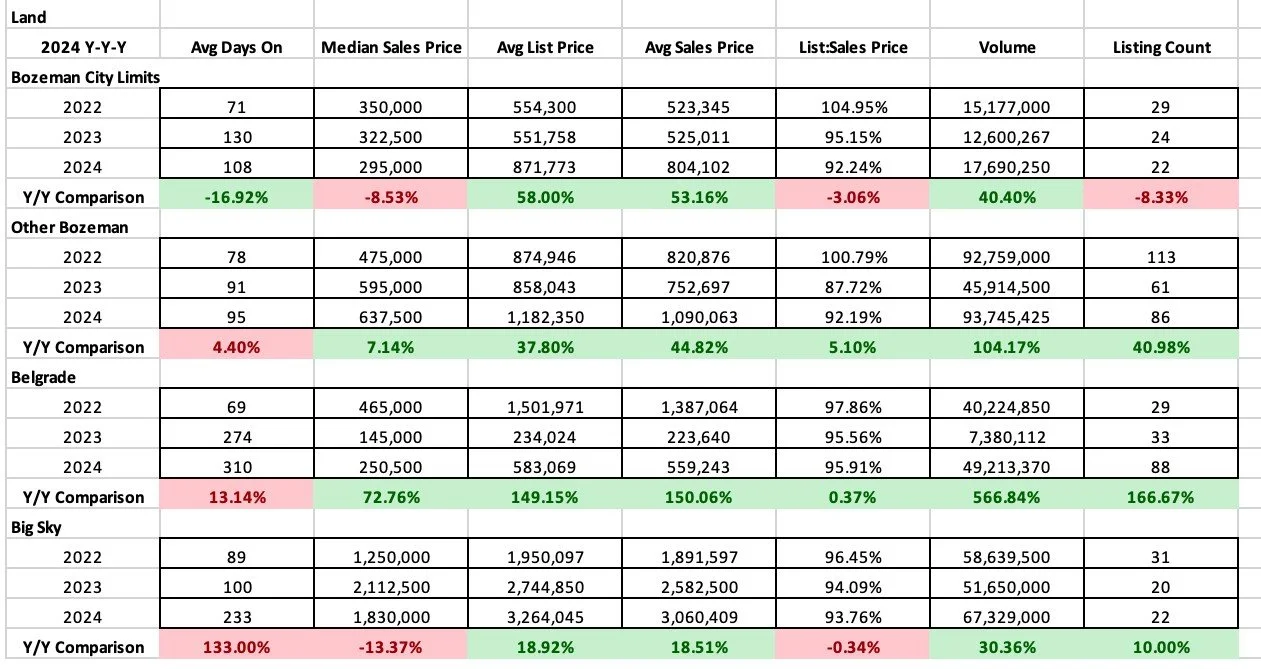 Land continued to stay relatively robust value wise and some areas showed an uptick over 2023. Median sales price in City of Bozeman ($295,000) dipped as did median sales price in Big Sky ($1,830,000). Median sales price in greater Bozeman ($637,500) jumped slightly and City of Belgrade ($250,000) appreciated more quickly due to multi-family lots selling in new construction neighborhoods.