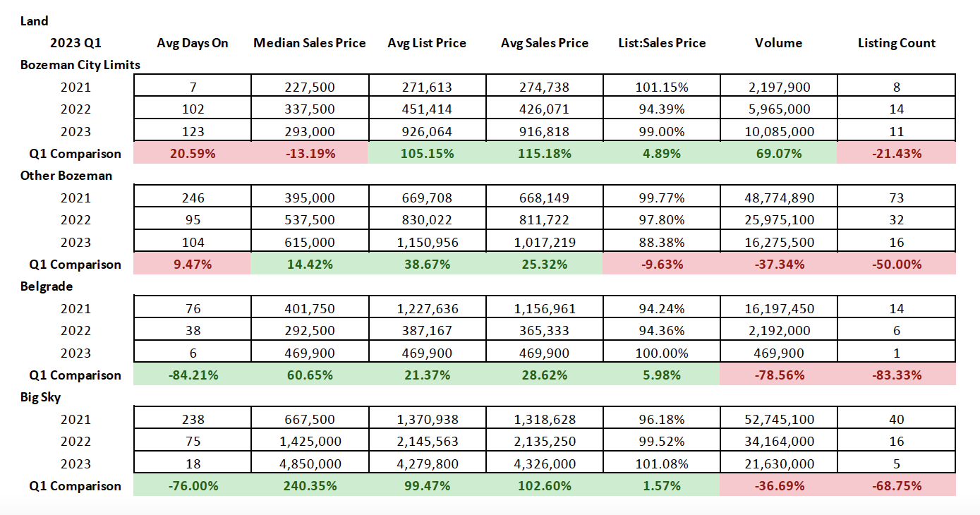 Land sales have continued to be pretty strong overall with median sales prices still climbing in greater Bozeman, Belgrade, and Big Sky, as buyers who haven’t been able to find the right product to purchase continue to buy land and build. With little inventory available, Belgrade only posted one sale during Q1 – down 83% from Q1 2022 when there were additional lots on market. City of Bozeman in Q1 2023 was off 20%, Greater Bozeman off 50% and Big Sky off 69% from number of sales posted in Q1 2022. Median sales prices were up 15% in greater Bozeman, 240 % in Big Sky, and down 14% in City of Bozeman. Sold volume was up in City of Bozeman – showing that lots sold were cheaper and perhaps not of like quality to product sold in Q1 2022. Sold volume was off in all other areas – declining 40% in greater Bozeman and 37% in Big Sky. List to sales price ratios showed that buyers were discounting less in City of Bozeman as inventory wanes and prices come down – 1% on average. Same for Greater Big Sky – with buyers actually paying above list price on average by 1%. Greater Bozeman is being discounted at 12% on average.