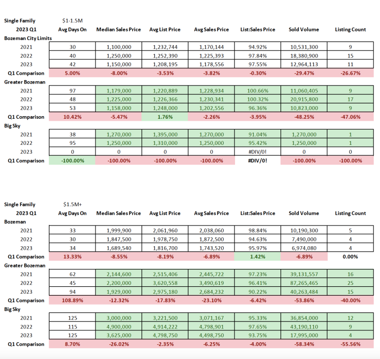 High-end single-family home sales – those between $1M-$1.5M in sold pricing, didn’t budge much between Q1 2022 and Q1 2023. Sales remain robust with higher sold listing count over 2021 but not over 2022 in all areas tracked (Bozeman, Greater Bozeman). Volume was off in City of Bozeman from 2022, but was above 2021 numbers. Days on market have increased slightly to about 1.5 months in City of Bozeman and 2 months in greater Bozeman.