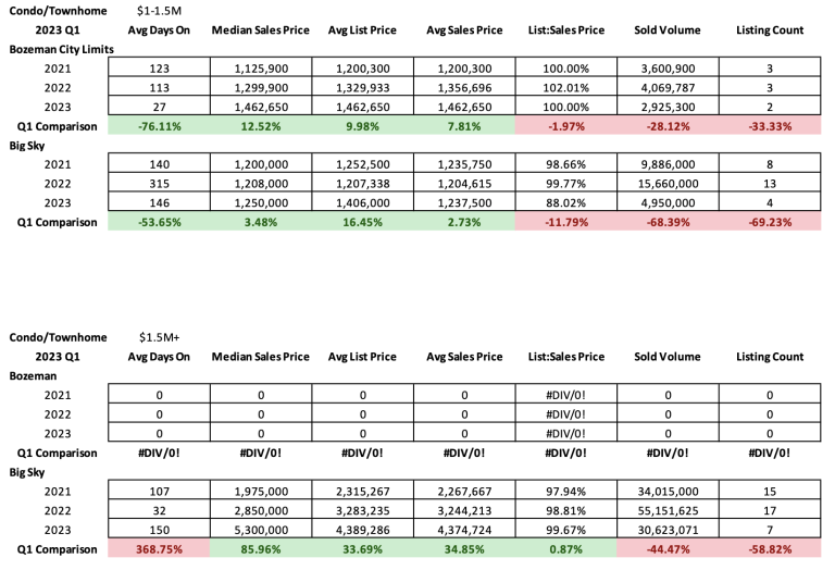 High-end condo and townhome sales (those between $1M-$1.5M in sold pricing) in the City of Bozeman had a significant drop in sold properties – off by 50% between Q1 2023 as compared with Q1 2022. List to sales price ratios showed very little discounting – less than 1% – indicating the scarcity of this sort of product in the City of Bozeman.