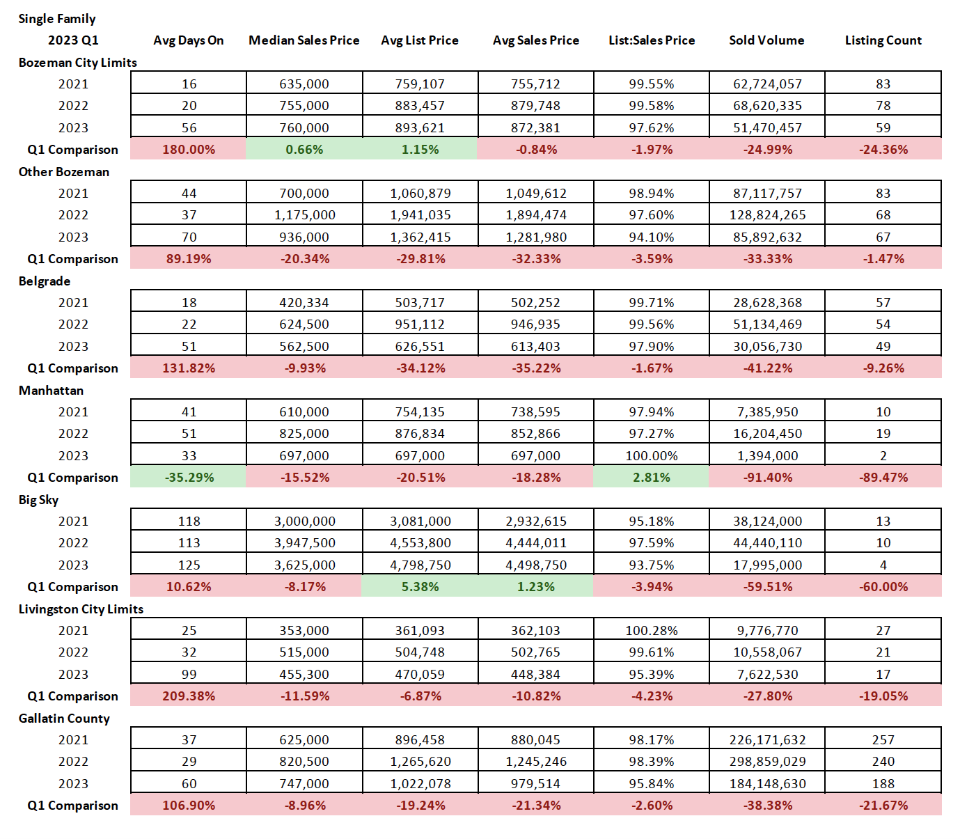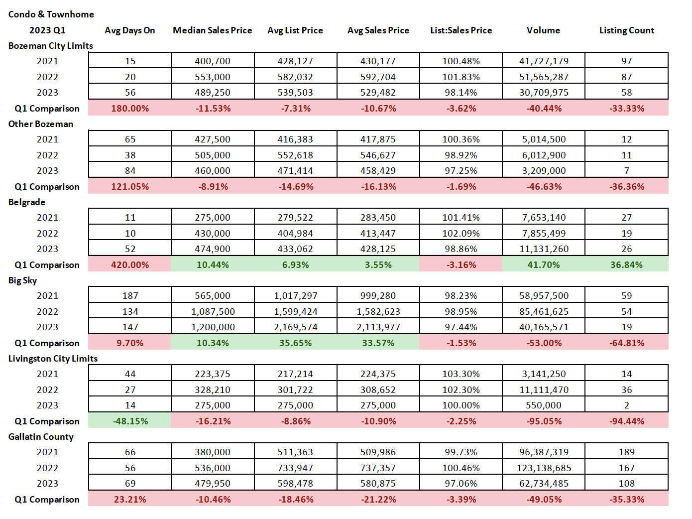 Single family home sales in Q1 2023 were across the board considerably slower than in Q1 2022 – days on market were up in all areas except Manhattan. Number of listings sold was down between 2-90% depending on area, with 25% in Bozeman, 2% in Bozeman surround, 9% in Belgrade, 90% in Manhattan, 60% in Big Sky, and 20% in Livingston. New listings on the market were off slightly between Q1 2022 and Q1 2023 – when combined with number of sold properties, there is a slight increase in inventory. Median sales price is off from Q1 2022, between 9-20% depending on area – with only City of Bozeman breaking even with flat appreciation. Some of the areas tracked had an influx of new construction last year that is now no longer hitting the market, which has skewed numbers slightly. List to sales price ratios show that buyers are negotiating with sellers at between 3-7% off current list price, depending on area. That is a bigger swing compared to last year when discount was closer to 1-2.5% off list price. Please note that there may be a difference between original list prices and final listing prices, which would indicate more discounting that is taking place than what is tracked here. Sold volume for Q1 2023 is lower by 25-60% from Q1 2022.
