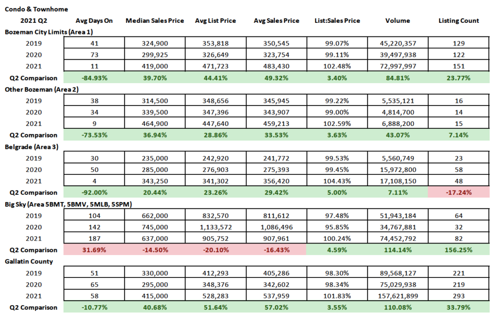 Condos and townhomes are seeing some of the biggest appreciation. Condos and townhomes were more affected by the pandemic in Q2 2020 than single family homes – likely due to those buyers that were buying wanting more elbow room from their neighbors and outside space. However in Q2 2021, the condos and townhomes have seen skyrocketing median sales prices in all areas except Big Sky – partially because there was a much needed an affordable housing project that closed a slew of units in Q2 2021 in the Meadow Village. Median sales prices have been well above 2019 and 2020 prices. In most areas the number of units sold has also been fairly constant or grown, with the exception of greater Bozeman and Belgrade as new construction on these products has waned. List to sales price ratios are over 100% in all areas tracked, with averages 2.5% over list price in Bozeman and Greater Bozeman. 5% over list price in Belgrade and 2% over list price in Big Sky.