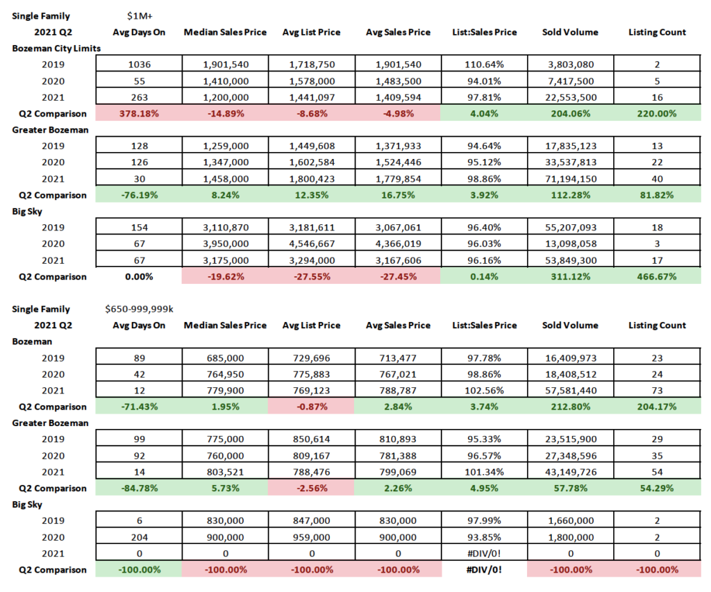 The number of units sold for high-end single-family homes in Bozeman spiked in Q2 2021 with almost 3x as many home sales in this price point then in the past. Greater Bozeman saw a 54% increase in number of sold properties. Big Sky had no homes under $600,000-$999,999 that sold in Q2 2021. City of Bozeman homes were going for 2.5% above asking in this price point in Q2 2021 and 1.3% over asking in Greater Bozeman area. Days on market were down to 12 days on average in City of Bozeman for this price point and 14 days in greater Bozeman.