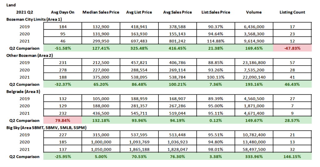 Interest in land in SW Montana has spiked over the past year, with land sales moving at an accelerated pace in many areas – when and where inventory can be found. Median sales price has climbed 127% for City of Bozeman lots, 65% for greater Bozeman lots, 132% for Belgrade area lots and 5% in Big Sky where pricing had already started to spike in 2020. For Big Sky, prices between 2019 and 2021 have gone up 233%. Number of units sold has increased over 2020 in all areas except Bozeman. However, due to Q2 2020 being the most heavily affected by the pandemic, this was an easy feat to accomplish. Only Big Sky is ahead of where number of sales were in 2019. The rest of our tracked areas are bumping along at sold numbers far below where they were in 2019. Partially due to lack of new subdivisions available for lot purchase. There are projects in the pipeline but there is still quite a bit of time to wait until many of these projects will be released to the open market.
