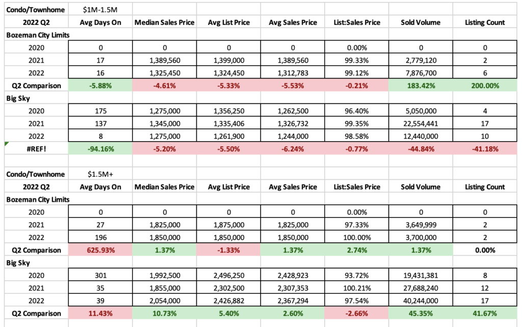 High end ($1M-$1.5M) condo and townhome sales are only tracked by KGRE in Bozeman and Big Sky. There was an increase in sold inventory in Bozeman year over year and a decrease in Big Sky. Average days on market have decreased dramatically in both areas. However, inventory is creeping up in this segment of the market.