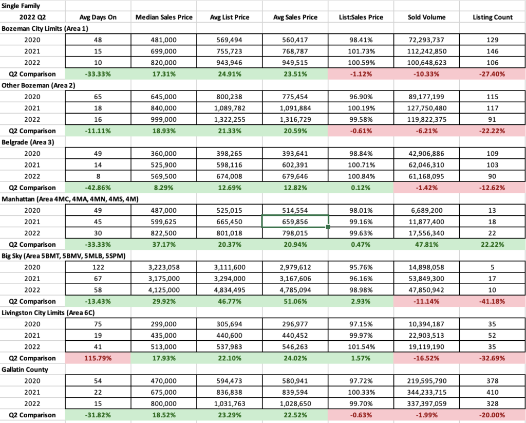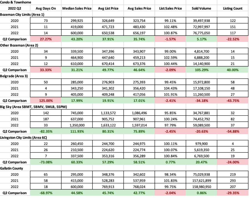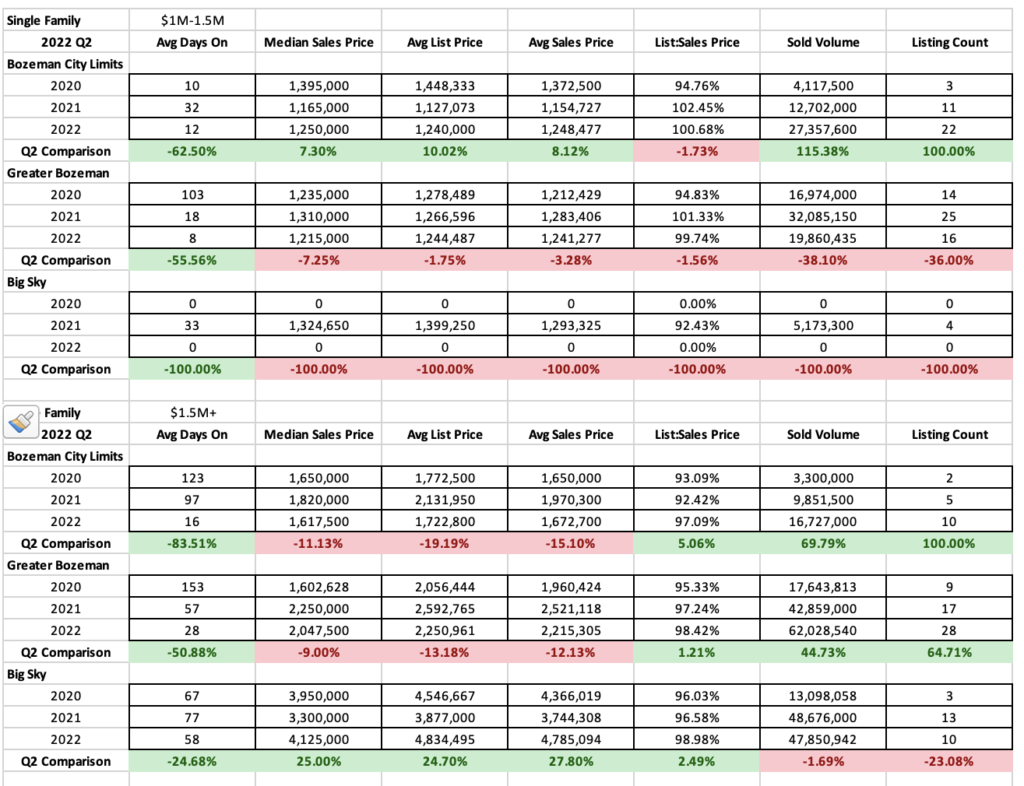 High end ($1M-$1.5M) single family homes have increased in City of Bozeman but decreased in greater Bozeman and no sales in Big Sky. Inventory counts are also increasing. List to sales price ratios show a very strong seller’s market. It will be interesting to see if this segment is affected by the recent mortgage interest rate hikes – this segment is naturally less impacted by inflationary pressures.