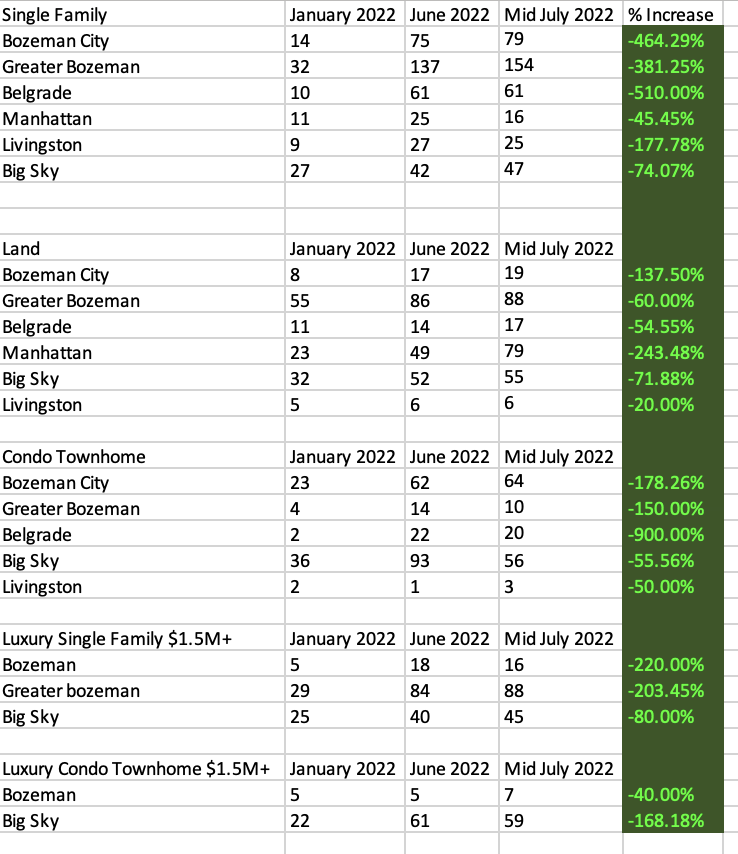 We’re seeing median sales price increases of 8-37% depending on area for 2022 over 2021 Q2 – much of this appreciation was ticking up end of 2021 through early 2022. It is this appreciation that is being picked away at by the market swaying into more of a neutral stance. Looking at inventory counts, inventory hasn’t shifted much between late June 2022 and mid-July 2022, but inventory counts are up an astounding 45-510% since January 2022! Some of the inventory counts haven’t been at the numbers they are now sitting at since 2020 and 2019. It’s looking like a more balanced market again. And overall this is a positive thing.