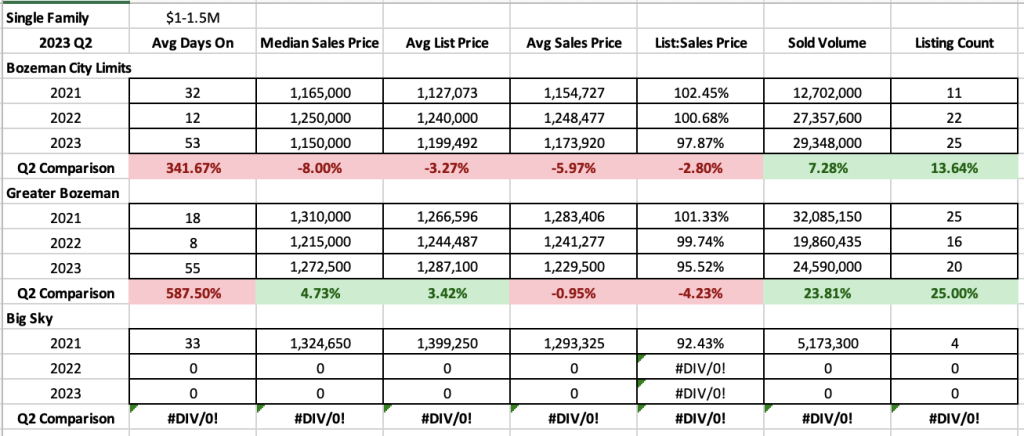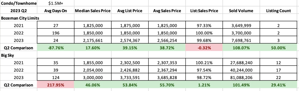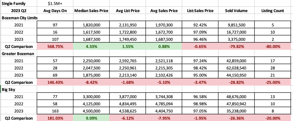 High-end single-family home sold listings (those $1M-$1.5M in closed price) in all areas tracked showed no new listings sold in the Big Sky are for the 2nd straight year in this price point and a significant uptick of solds over Q2 2022 in City of Bozeman and the greater Bozeman area – with 14% more properties selling in City of Bozeman and 25% more properties in greater Bozeman. Days on market are up significantly in this sector of the market – with close to two months on average prior to getting an offer (up from about a week in 2022). List to sales price ratios show buyers discounting 3-5% on average – up from almost no discounting in 2022 – indicative of a balanced market.