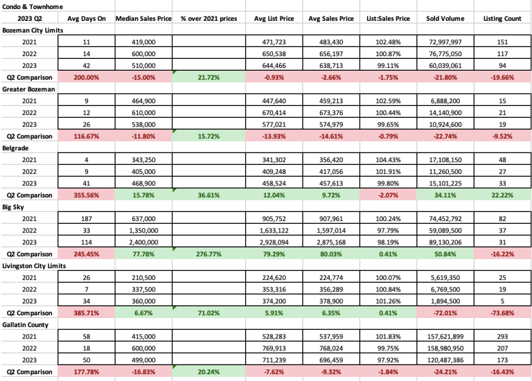 Condo and Townhome sales have some very interesting data points. As expected, median sales prices for condos and townhomes in the areas tracked show a drop in pricing in City of Bozeman and greater Bozeman Q2 2023 over Q2 2022. But in Belgrade, Livingston and Big Sky, median sales prices have continued to heat up, mostly due to new construction product in both markets.
