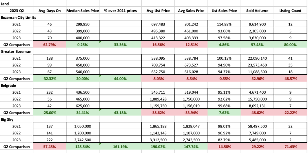 Median sales price for land is relatively flat Q2 2023 over Q2 2022 in the City of Bozeman but has rocketed in Belgrade (34%), Greater Bozeman (20%) and Big Sky (128%) year over year. Showing continued high demand by buyers with discretionary funds.