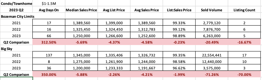 High end condo and townhome sales (those $1M-$1.5M in closed price) showed reduced sold listings in the Big Sky area, the third straight year of declines as prices move out of this bracket. Listings sold were also down slightly in the City of Bozeman area. Days on market have accelerated to 2 months (up from 2 weeks in 2022) in City of Bozeman and up to month in Big Sky (up from 1 week in 2022).