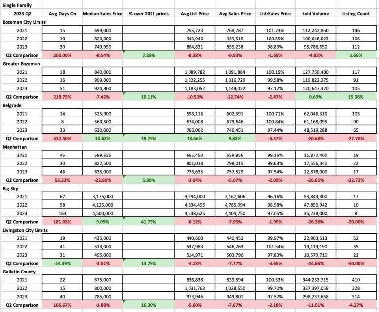 The slowdown in median sales price appreciation in Southwest Montana for Single Family homes that we have observed since late 2022 spring and that continued throughout the remainder of 2022 and start of 2023 continues to dominate the data. However, there are some very interesting data points worth highlighting. The number of homes sold during Q2 2023 over Q2 2022 has INCREASED in City of Bozeman and Greater Bozeman – perhaps buoyed by buyers both getting used to increased interest rates and jumping into the market in 2023 and lower prices than 2022. In other areas, sales numbers are off anywhere from 20-40% including Belgrade, Big Sky and Livingston.
