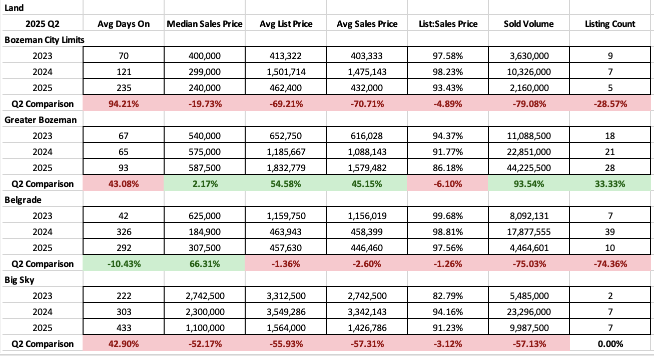 Number of land sales was pretty flat year over year in all areas tracked with the exception of Greater Bozeman which interestingly had a spike in sales in Q2 2025.