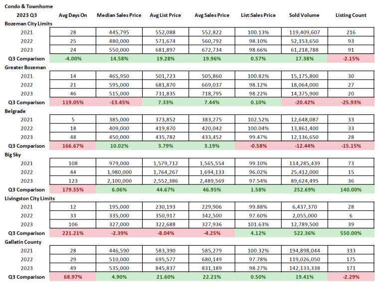 Single family homes have continued to post record median sales price appreciation in many geographic areas tracked. City of Bozeman median sales price settled at $824,250 for Q3 2023 – this is the highest it’s ever been and just slightly higher than what we were considering the ‘peak’ for Pandemic pricing in Q1/Q2 2022. Greater Bozeman hit its 2nd highest peak at $1,140,000 median sales price (all time high at $1,175,000 in Q1 22). Belgrade hit is 3rd highest peak at $620,000 (Q2 2023 was at $630K and Q1 2022 was at $624K). Livingston hit its all-time high at $535K. Big Sky was tied with Q2 2023 for all time high at $4,500,000.