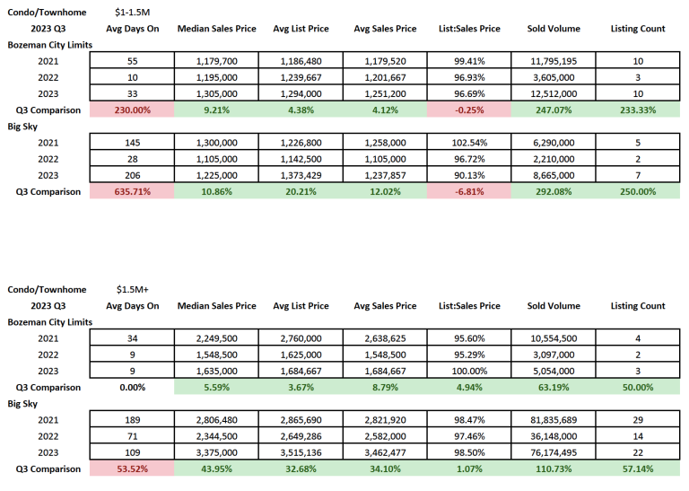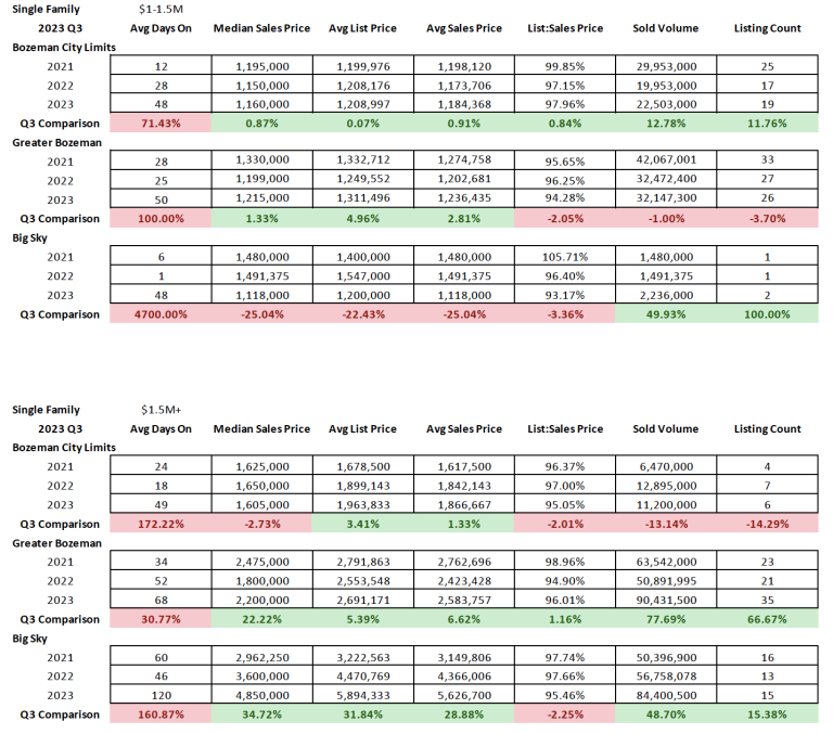 High end single-family home sold listings (those priced $1M-$1.5M) in all areas tracked were flat to slightly improved for the number of units sold Q3 2023 over Q3 2022. This is indicative of this segment of the market’s ability to be as affected by interest rate fluctuations. Days on market have increased to almost 2 months for each of the areas tracked, City of Bozeman, Greater Bozeman and Big Sky. List to sales price ratios show a balanced to slightly tilting buyer’s market with 2% discounting on average off list price in City of Bozeman, 5.75% discounting on average in Greater Bozeman and 7% discounting in Big Sky on average.