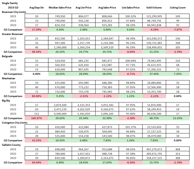 Number of units sold are not far off of last years stats for Q3 2023 – in all areas it was equal to or slightly less units than last year, Q3 2022. The biggest change year over year is that average days on market are elevated in most areas tracked – this is in line with a growing inventory of properties that are experiencing price reductions to attract buyers – a combination of interest rates/overpricing/buyers being more . Average days are ranging from around a month in Belgrade, Livingston and City of Bozeman to 1-2 months in greater Bozeman and Manhattan to closer to 4 months in Big Sky. Of note, there less inventory available on the market, though properties are siting longer, than during Q2 2022.