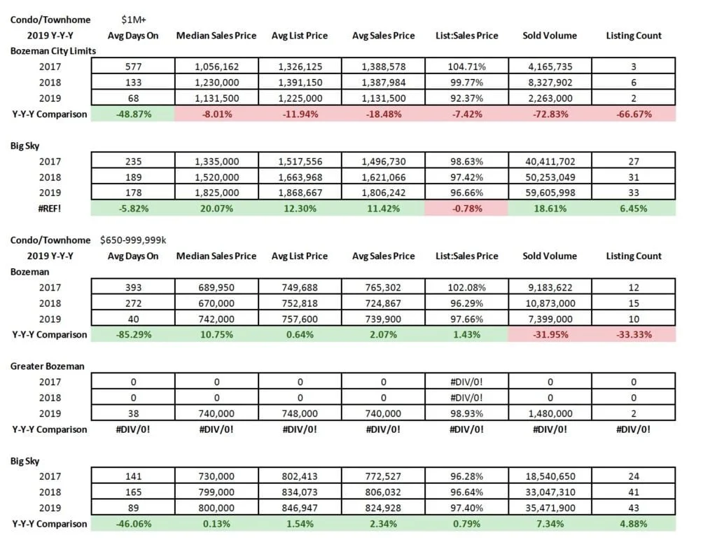 High end condo and townhome sales year over year have remained constant in Big Sky and dropped slightly in Bozeman. List to sales price ratios show minimal discounting on average, indicating a seller’s market in this sector.