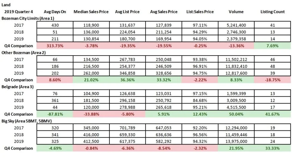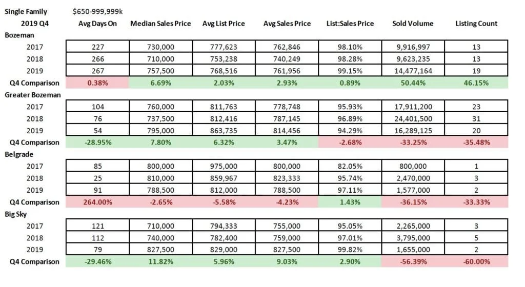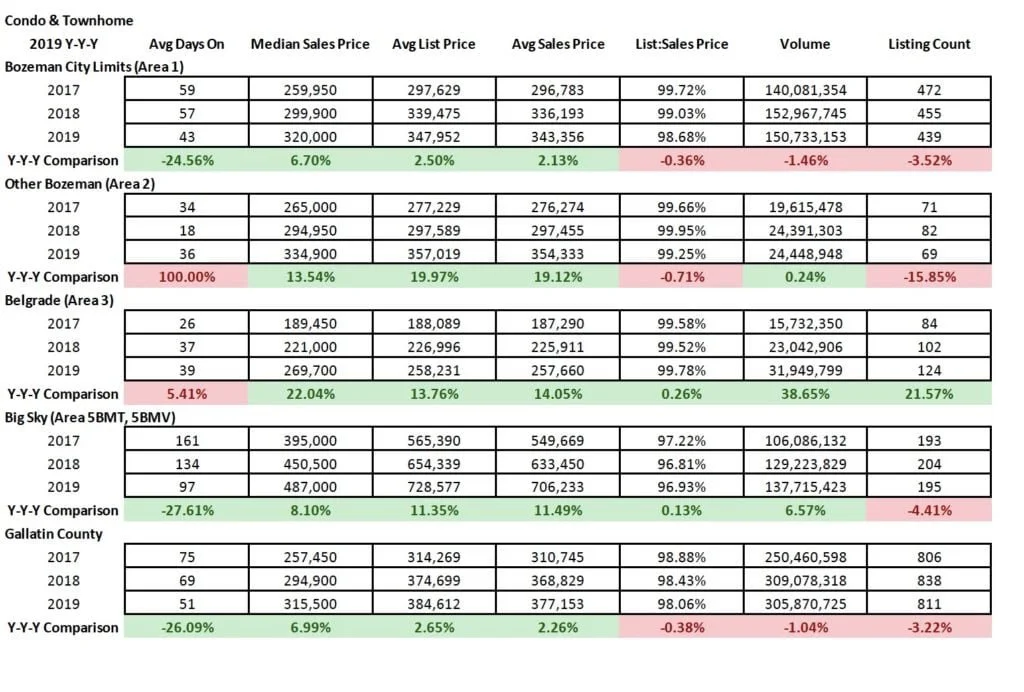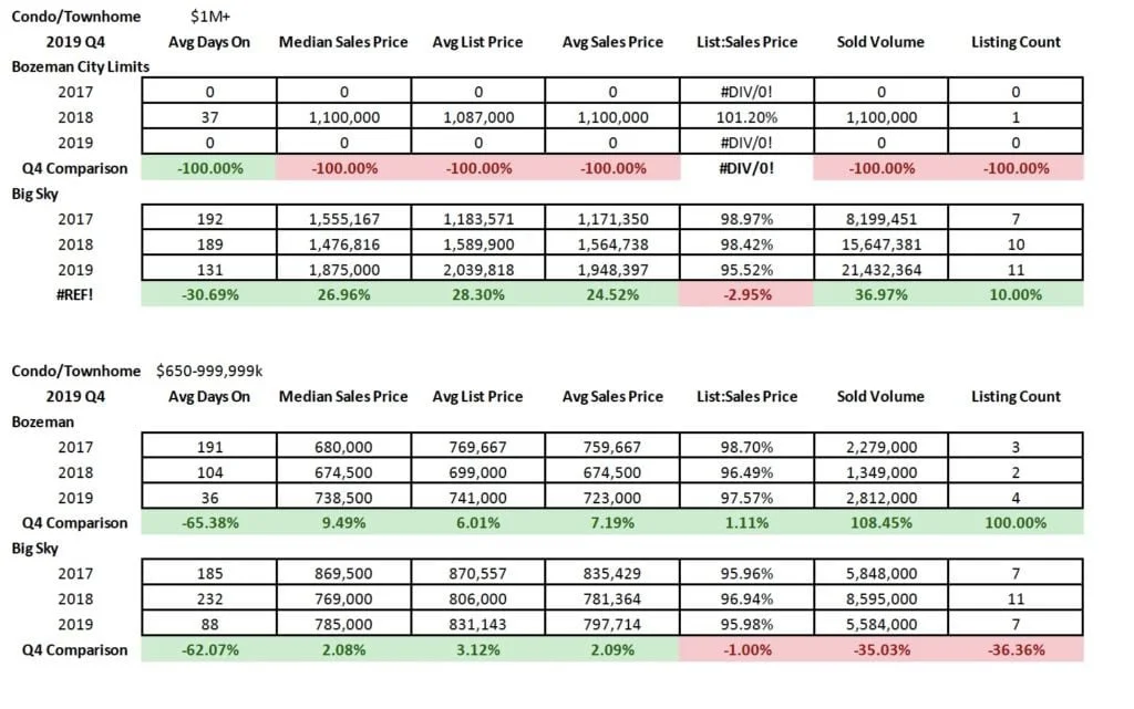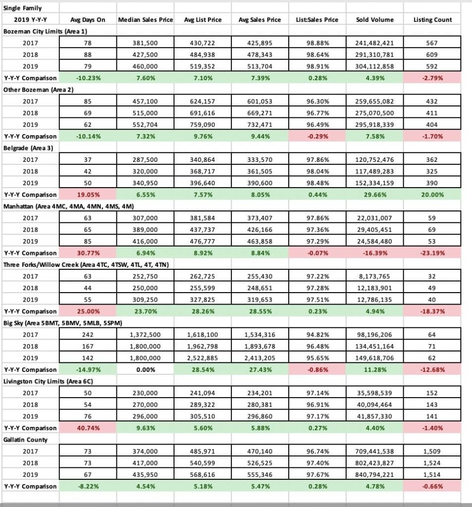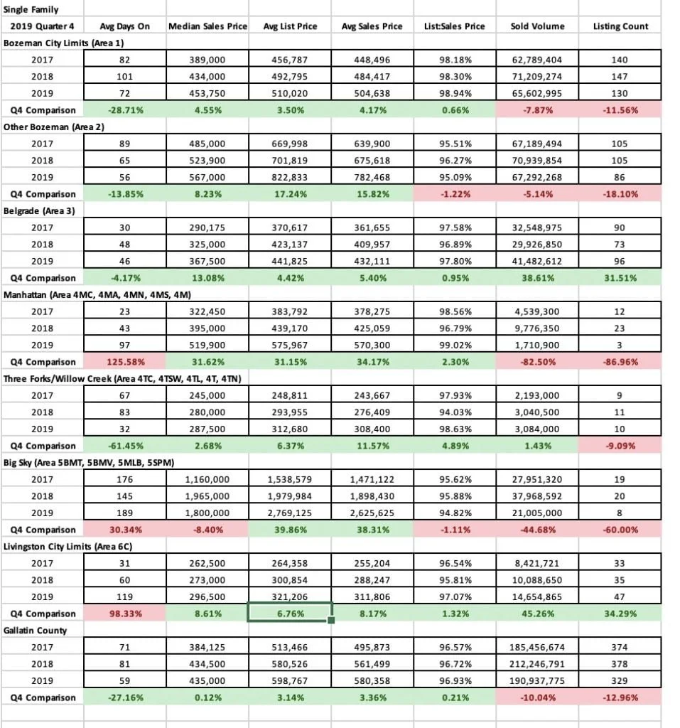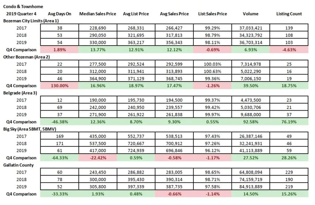 The market in Quarter 4 2019 continued the theme of growth in most sectors and areas of the market. Single family home sales saw median sales price jumps of 4% in City of Bozeman and 13% in City of Belgrade Y/Y – with 8% in greater Bozeman and Livingston City Limits. Big Sky saw a slight decline in median sales price as half as many homes sold in Q4 – as inventory tightens. Days on market are up in Big Sky, Livingston, and Manhattan – and down in Bozeman, Belgrade and greater Bozeman areas. Average list to sale price ratios show minimal discounting in Bozeman, greater Bozeman, Manhattan and Belgrade – slightly more in Livingston and Big Sky – but all indicative of a continued seller’s market. Number of units sold has trended downward in most areas of the market, with Belgrade as the only area showing a positive jump of 31% as new construction continues to boom there.