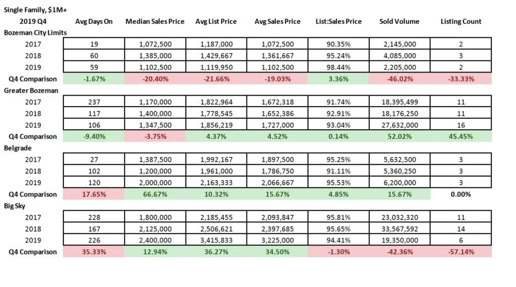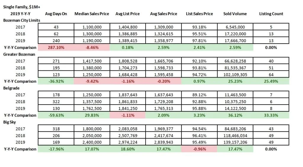 Luxury ($1M+) single family home listings year over year have stayed constant in Bozeman, Belgrade and Big Sky to pervious years and ramped up in greater Bozeman area. Days on market have reduced Y/Y in all areas except City of Bozeman, with times averaging 4 months in greater Bozeman and Belgrade to 5 months in Big Sky and 8 months in Bozeman.