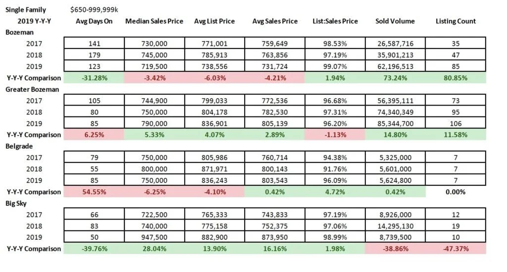 High end ($650K-$999K) single family home listings year over year have showed strong activity across all areas. List to sales price ratios show a strong seller’s market in City of Bozeman and Big Sky with little dis counting. Number of units sold has ramped up considerably in City of Bozeman and greater Bozeman areas as well. Days on market are ranging from just over 4 months in City of Bozeman to closer to 3 months in greater Bozeman and Belgrade and just under 2 months in Big Sky.