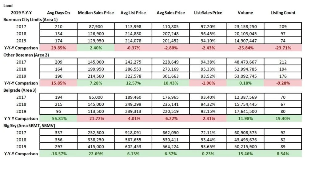 Land sales have stayed relatively flat in City of Bozeman as new product has waned. Greater Bozeman area has seen a decent jump in median sales price. Number of listings sold has jumped in Big Sky and Belgrade – likely translating partially to pipeline new product that will hit the market in 2020. Overall discounting of about 4-5% is commonplace – indicative of a more balanced market.