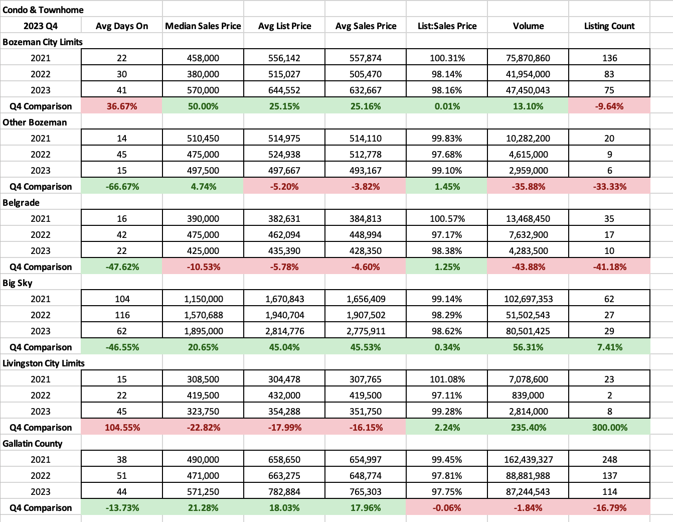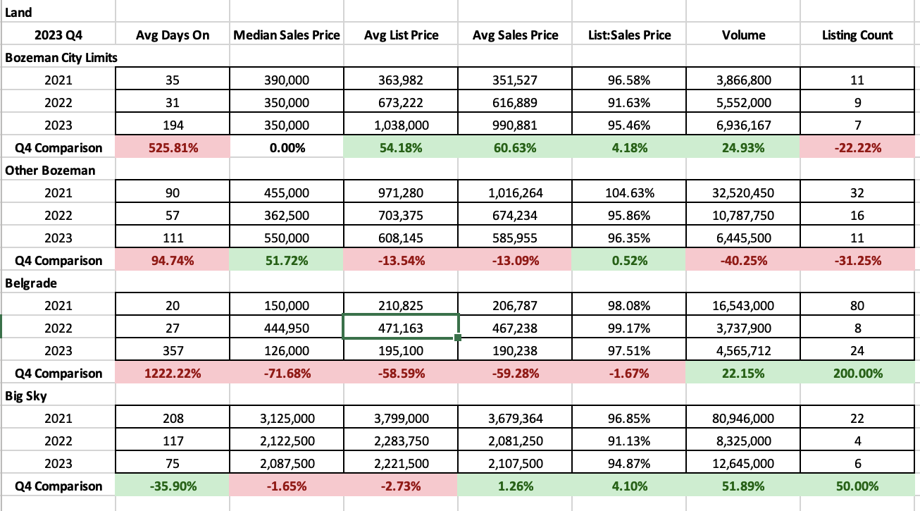 Land continued to be relatively strong overall in Q4 2023 which may come as a surprise to some. Median sales prices in City of Bozeman are flat and steady at $350K. Greater Bozeman saw an uptick of $50% to $550K. Belgrade had a bit of an anomaly for pricing comparison in 2022 but remains down over 2021 by 16% ($126K). Big Sky was relatively flat ($2.1M).