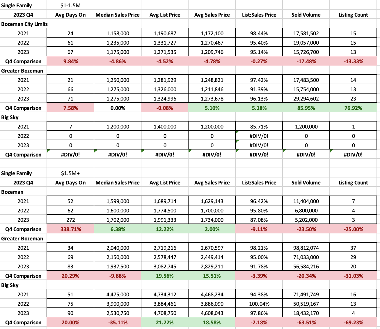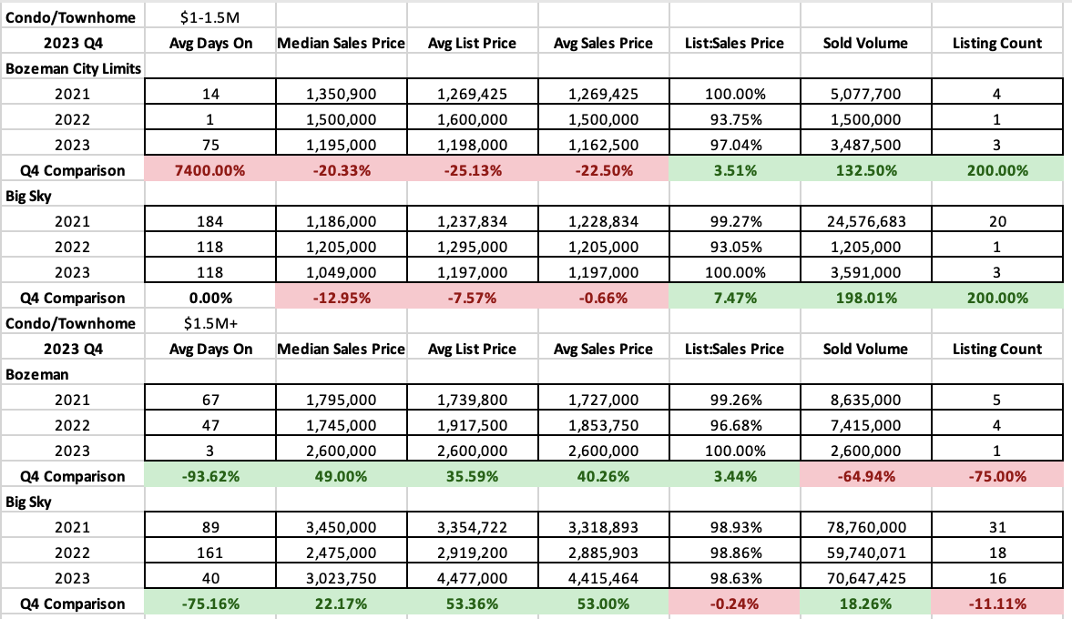 High end single family homes, those listed between $1M-$1.5M, saw a similar number of sales in Bozeman City Limits in Q4 2023 as Q4 2022 and a significant uptick in Greater Bozeman. Big Sky continues to have no single home inventory in this price bracket. Days on market were up to just over 2 months in both City of Bozeman and Greater Bozeman. And list to sales price ratios show 4-5% discounting by buyers on average – a sign of a stable market.