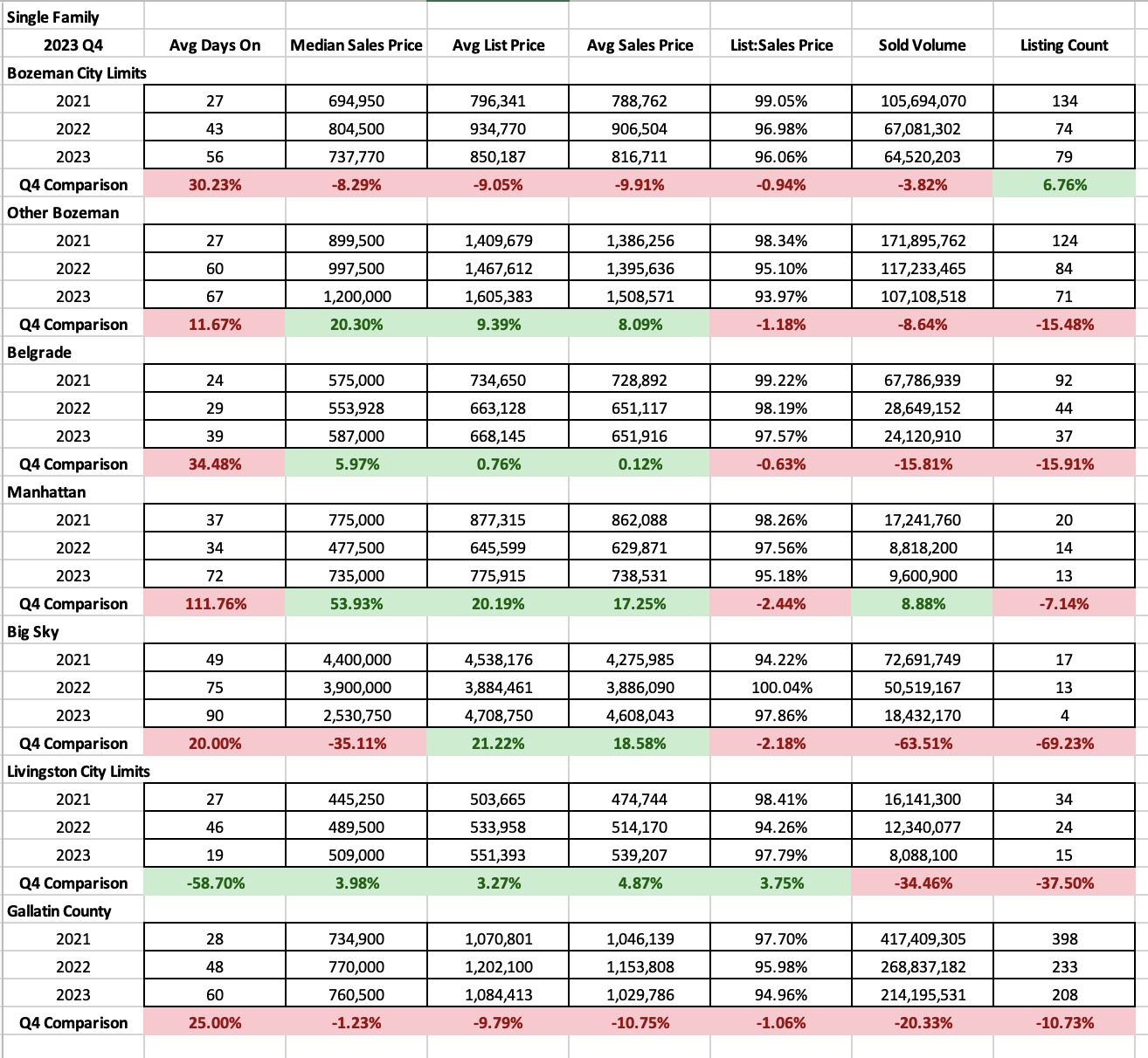 Median sales price trends for Single Family homes are a bit scattered area by area – City of Bozeman saw an 8% decline in Q4 2023 over Q4 2022 ($737K) and Big Sky saw a decline of 35% in Q4 2023 over Q4 2022 ($2.5M) though this is highly influenced by lack of properties closing (down 60%). Greater Bozeman area saw an increase in median sales price by 20% ($1.2M), Belgrade was up 6% ($587K), Livingston was up 4% ($509K) and Manhattan was up 53% ($735K) though 2022’s stat median sales was a bit of an anomaly. Prices have not budged much if at all off 2021 peak pricing and in many cases the prices have grown significantly.
