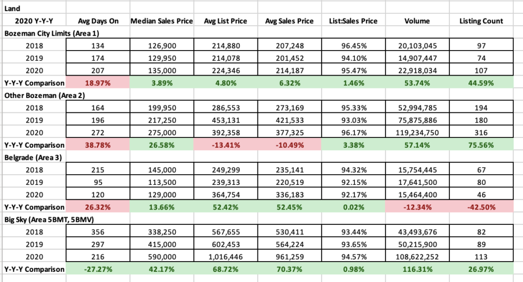 Land sales sparked up in most areas during Q4 2020, only decreasing due to lack of new inventory. Bozeman had a 72% increase year over year as new developments were bought up. Other Bozeman areas shot up 160% as acreage became desirable and Big Sky jumped 75%. Median sales prices accelerated in all areas except Belgrade which was flat due to lack of inventory. Big Sky median jumped an impressive 52% ($625,000). List to sales price ratios tightened in all areas with exception of Big Sky. Discounting of 4-6% is typical on land deals across the board.
