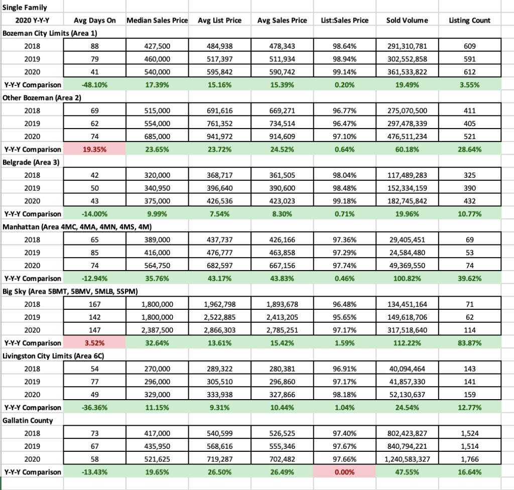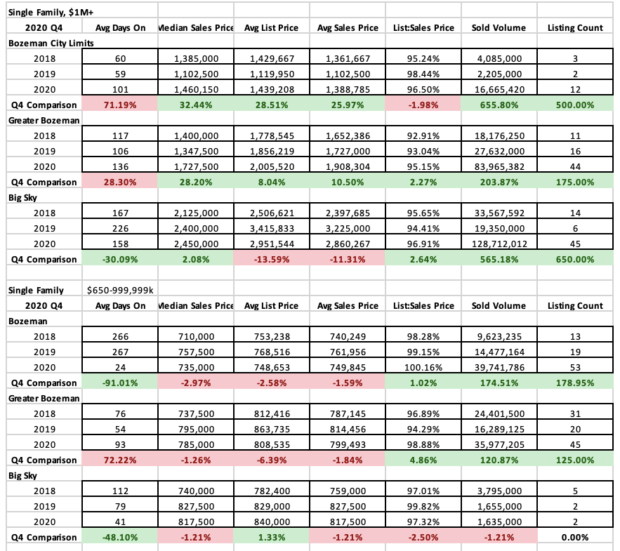 Sold listing counts for Q4 year over year were up significantly in Manhattan, Big Sky, and Greater Bozeman – properties with land were in very high demand. Number of single-family homes sold was up 487% in Big Sky, 666% in Manhattan and 66% in greater Bozeman. Sold listings were up 20% in City of Bozeman. Sold listings were up only 2% in Belgrade and went down 20% in Livingston due to lack of inventory available.