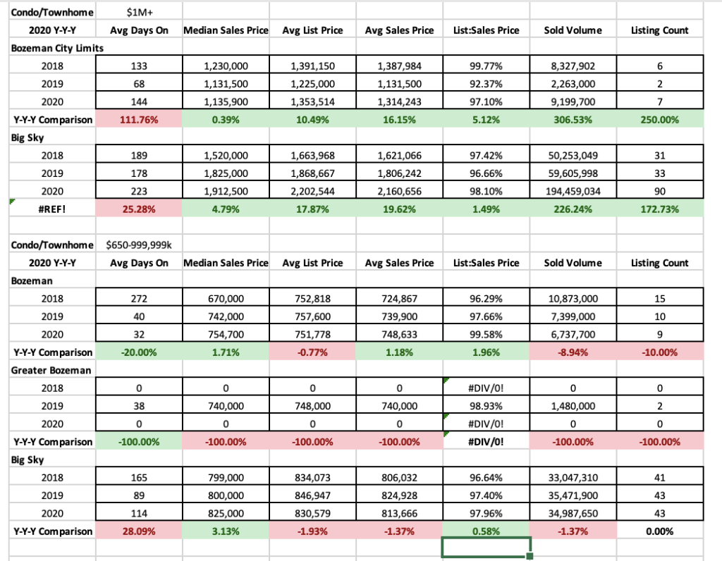 Luxury condo and townhome sales in the City of Bozeman were up 600% year over year for condos over $1M. Big Sky experienced a 300% increase in sales year over year. New construction inventory has fueled this expansion of the market in both areas with new product in downtown Bozeman, fairly new resale product in downtown Bozeman and tons of new luxury product at Moonlight Basin.