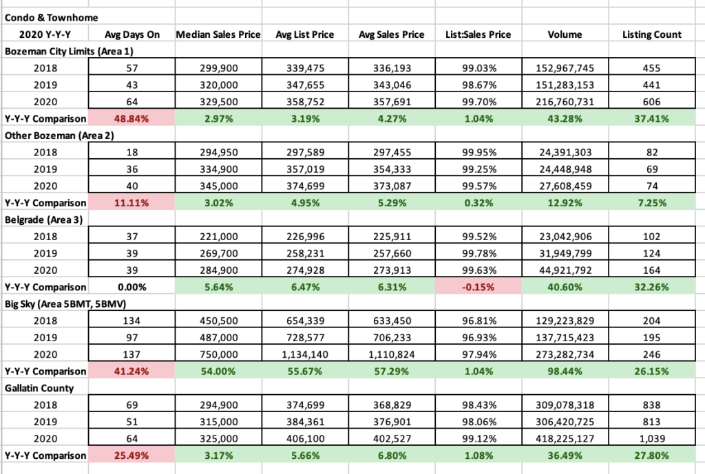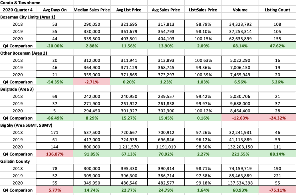 Condos and townhomes during Q4 2020 in the Bozeman, greater Bozeman, Big Sky and Belgrade areas had another banner year. Median sales price was up in all areas except greater Bozeman. Big Sky had a 91% price hike as luxury new construction properties proliferated the market. City of Bozeman increased 3%. Belgrade increased 8%. Number of listings sold shot up 47% in City of Bozeman and 88% Big Sky due to new construction product brought to market. List to sales price ratios narrowed in all areas – with all areas but Big Sky logging over 100% ratios. Meaning buyers on average were paying above sales price for properties in Bozeman, greater Bozeman and Belgrade. A function of commonplace multiple offers.