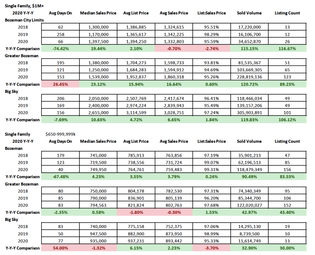 Condo and townhome sales in the $1M+ luxury segment were up 250% in City of Bozeman and 173% in Big Sky. These numbers were fueled by new construction projects that came to market in 2020 in downtown Bozeman and Moonlight Basin.